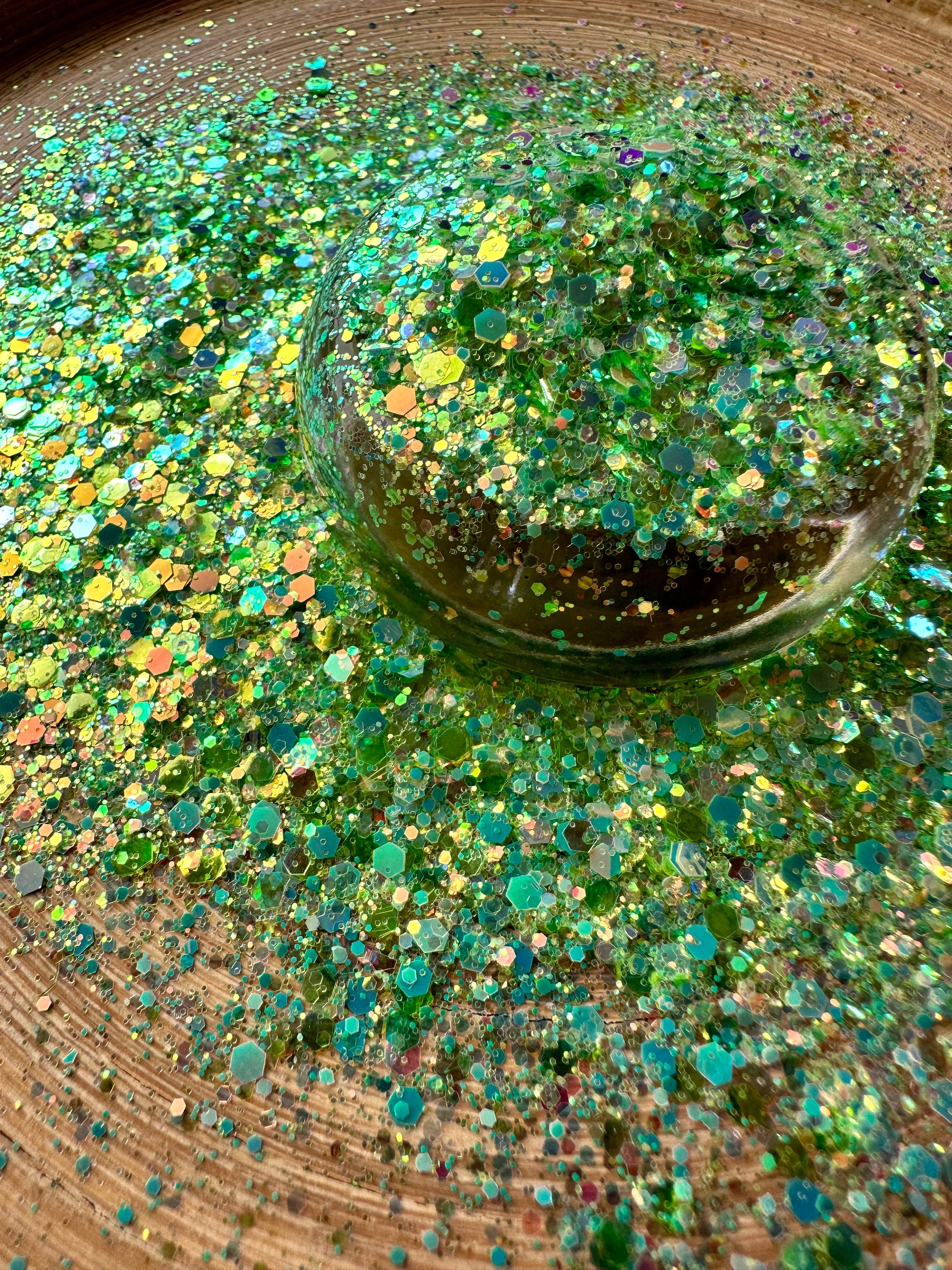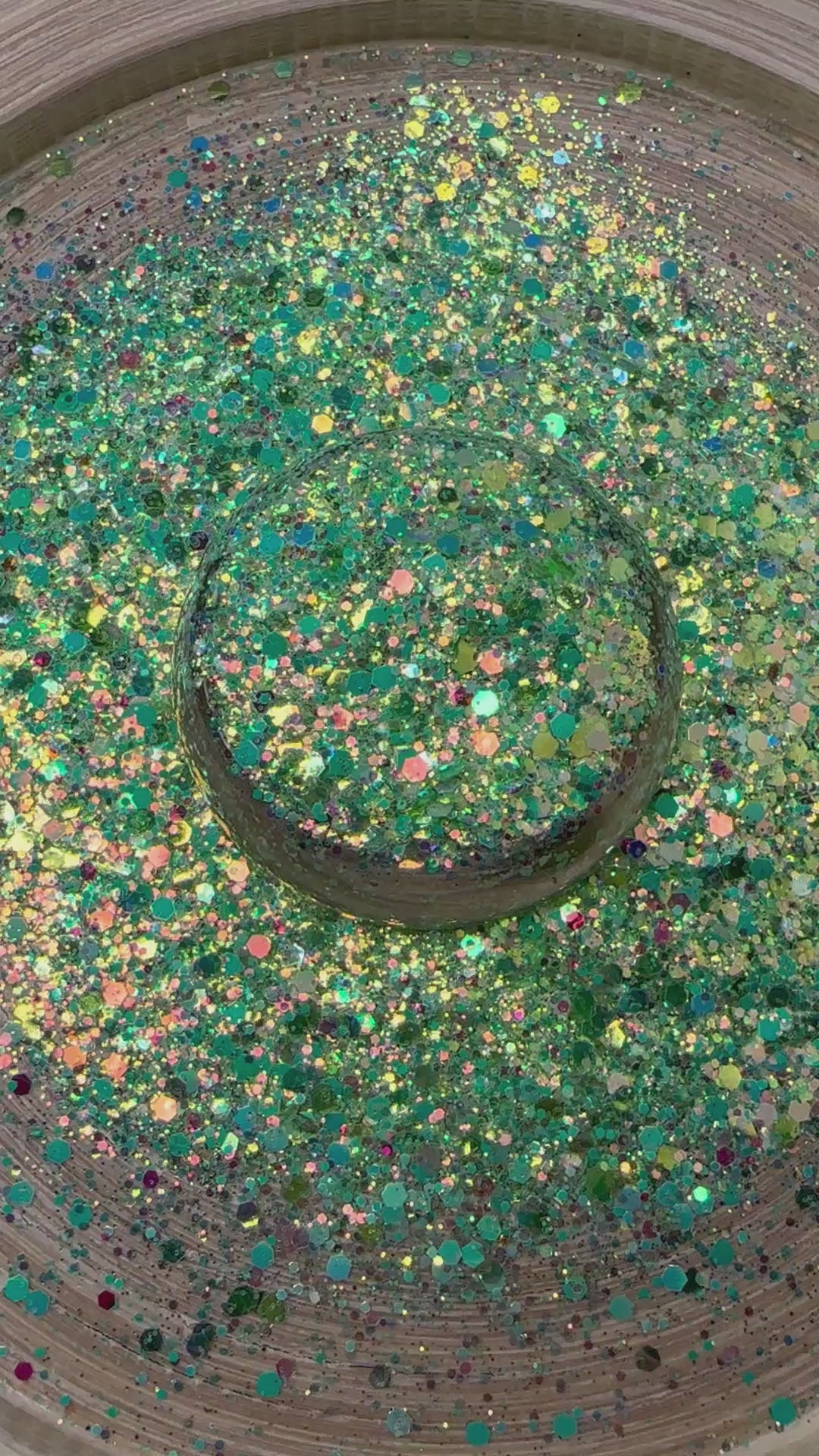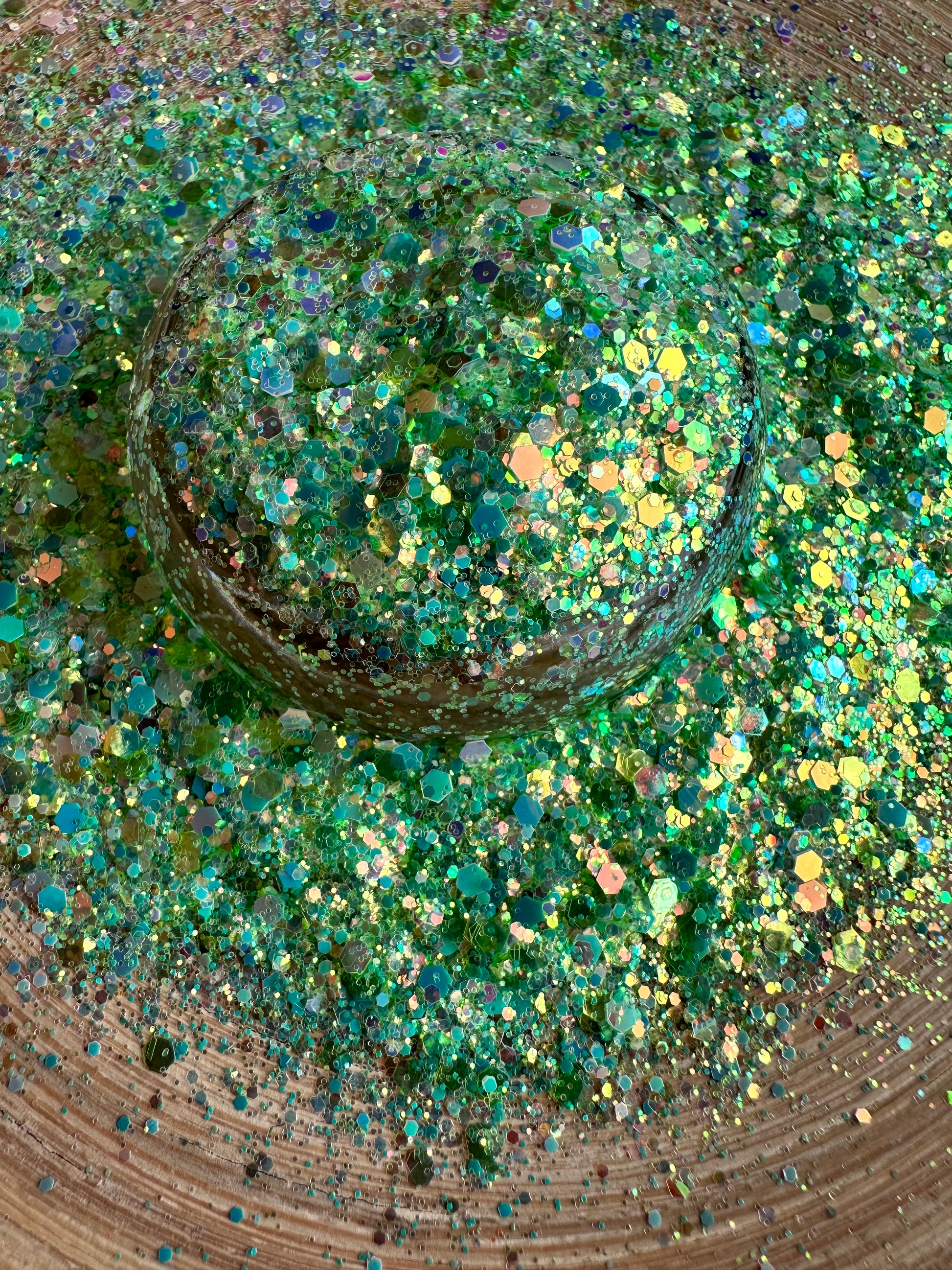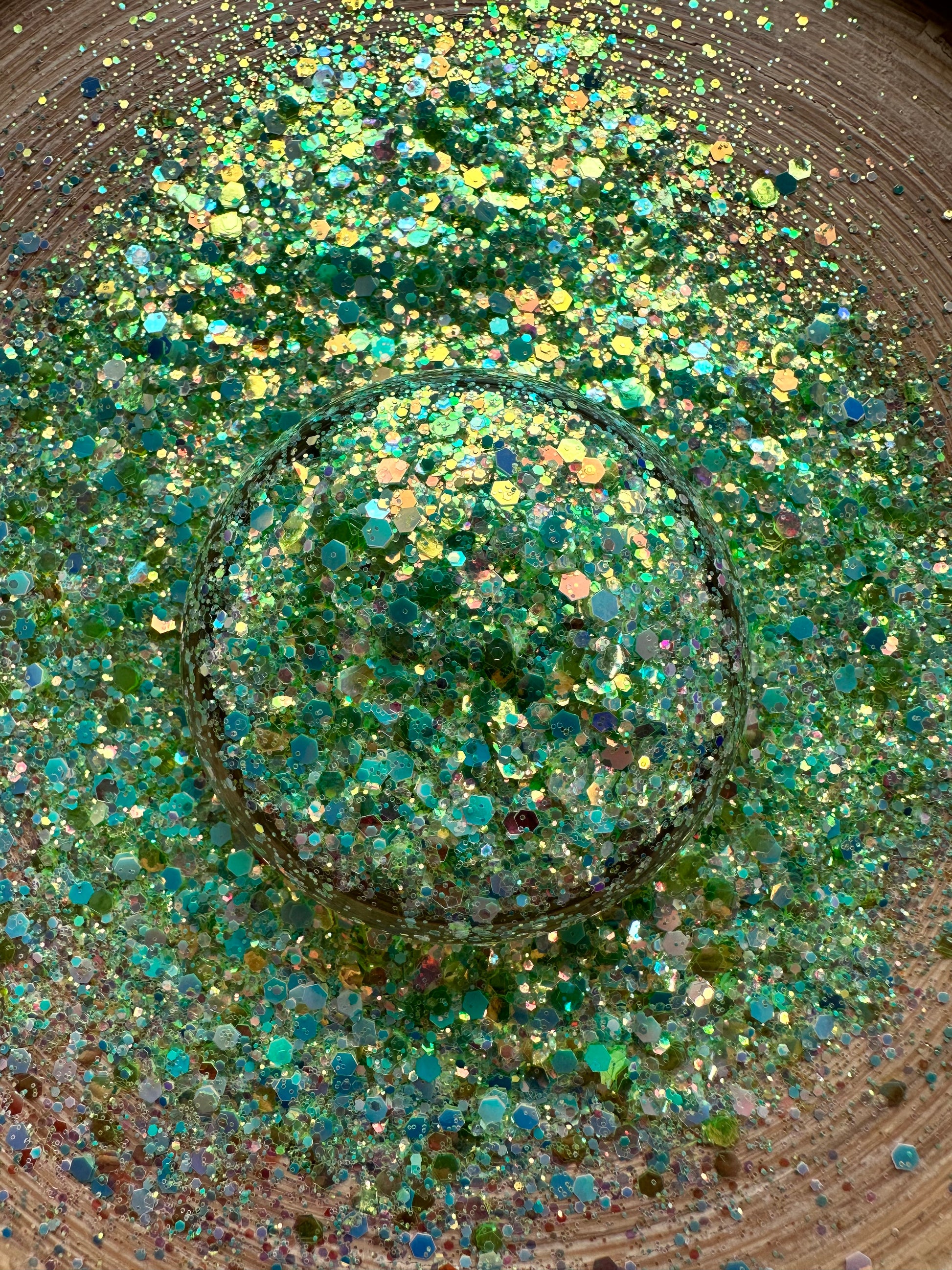Poltergeist is a gorgeous glow in the dark green Chunky mix. High sparkle with semi-translucent and mirror pieces.