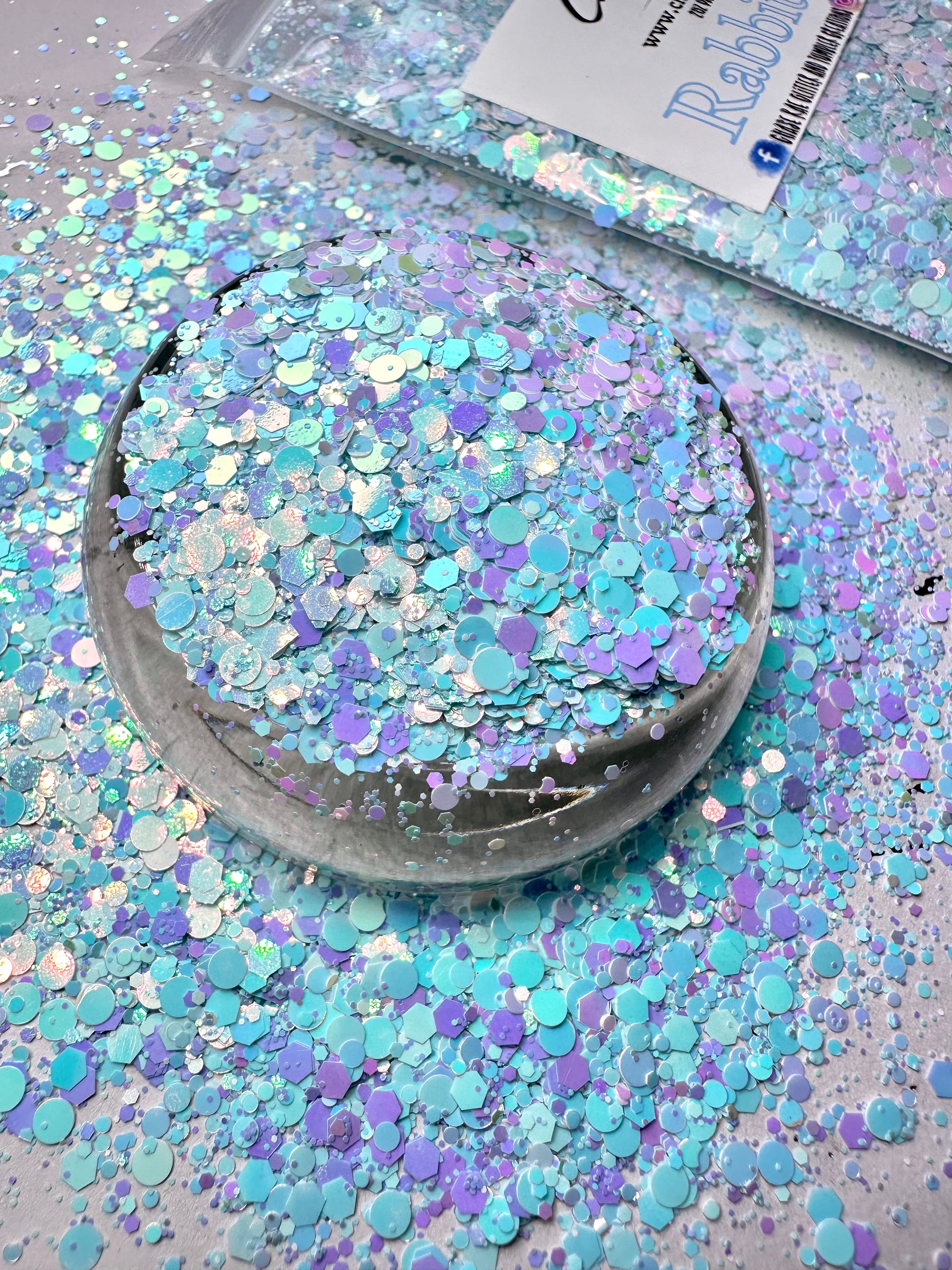An iridescent chunky mix with hexagon and circle shapes. Solid in color.