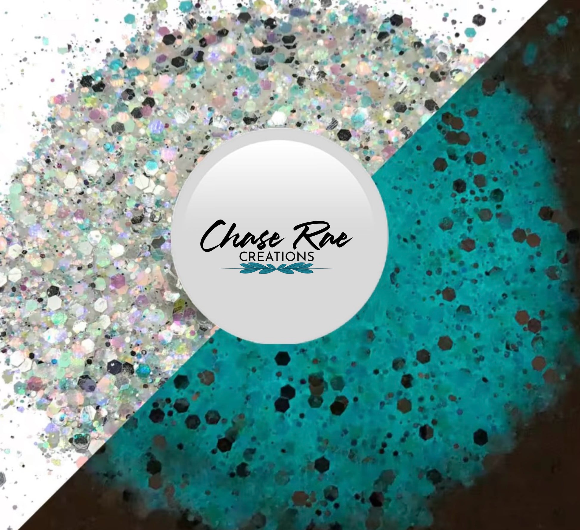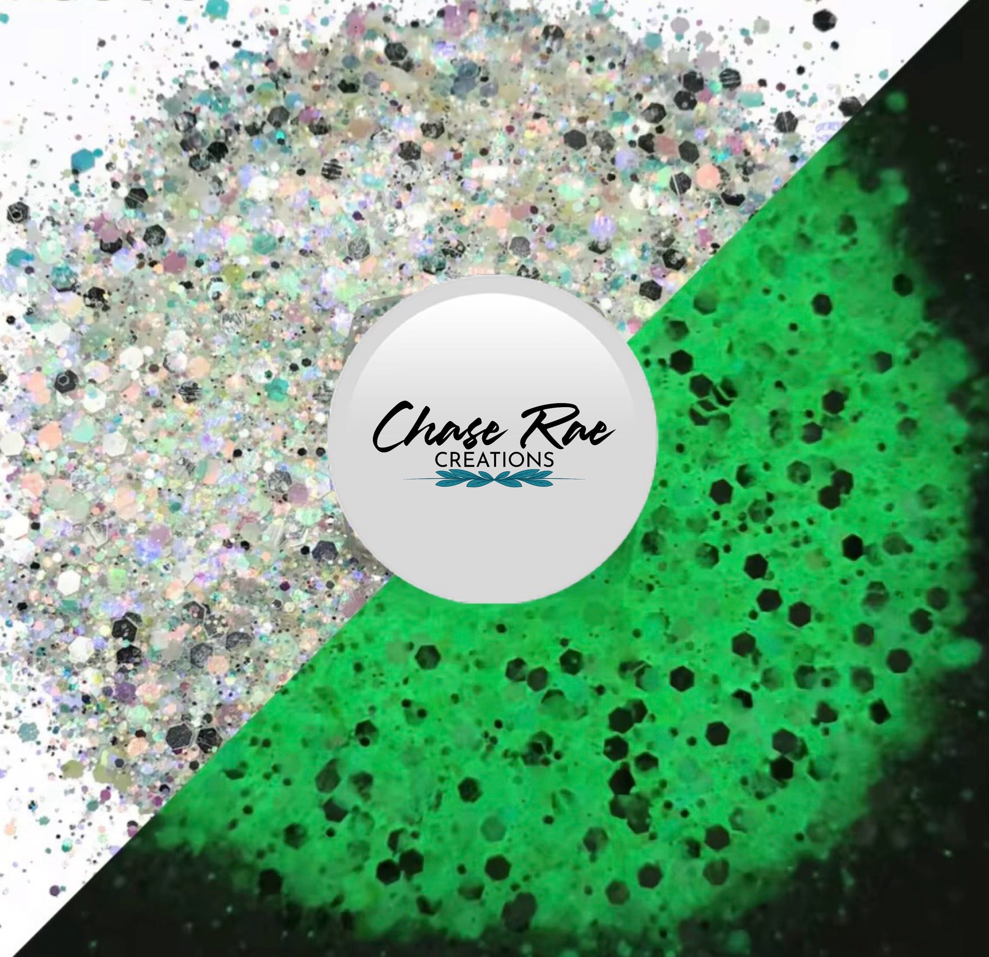 Radioactive is a gorgeous glow in the dark chunky mix. Metallic and high sparkle with whites, holographic and mirror pieces .