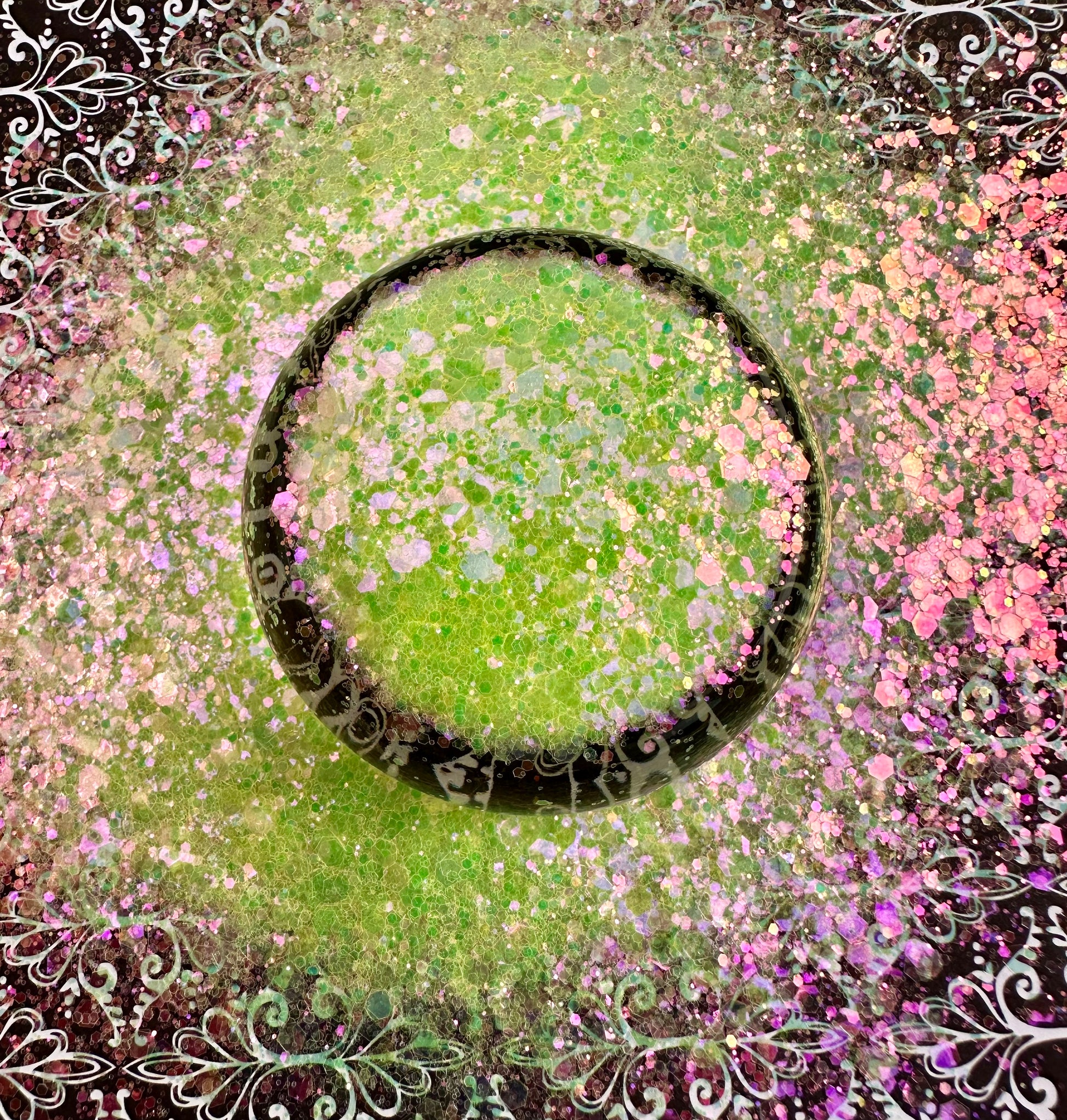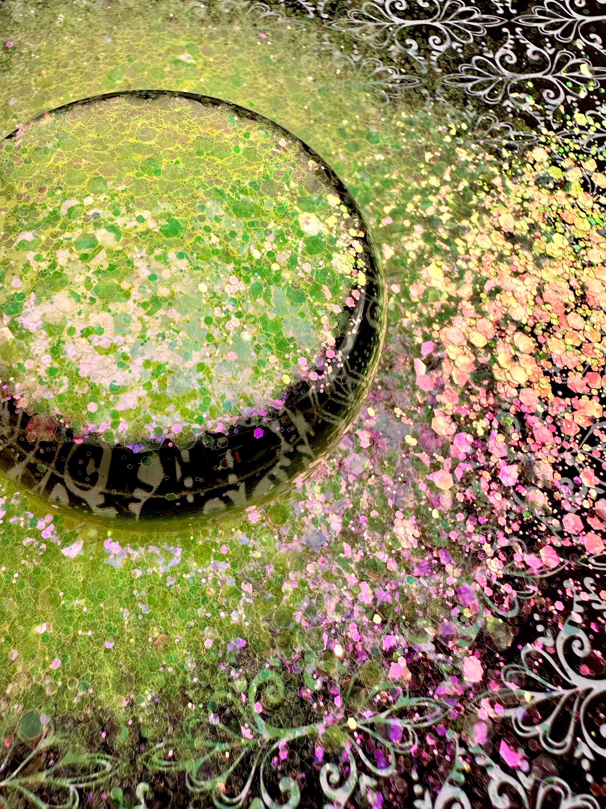 Rhapsody 2.0. Bright yellow chunky mix with a pink iridescence on dark surfaces.