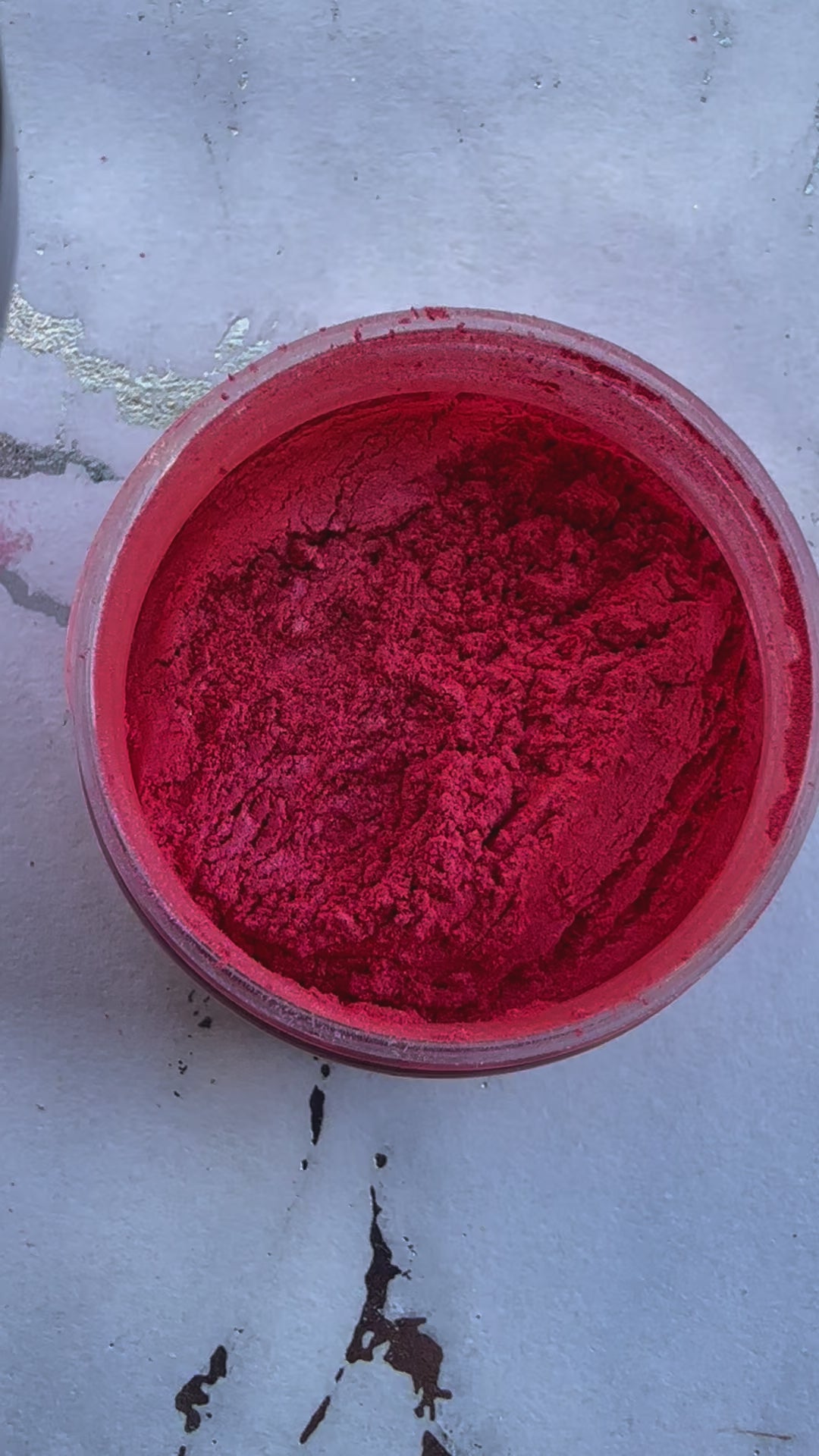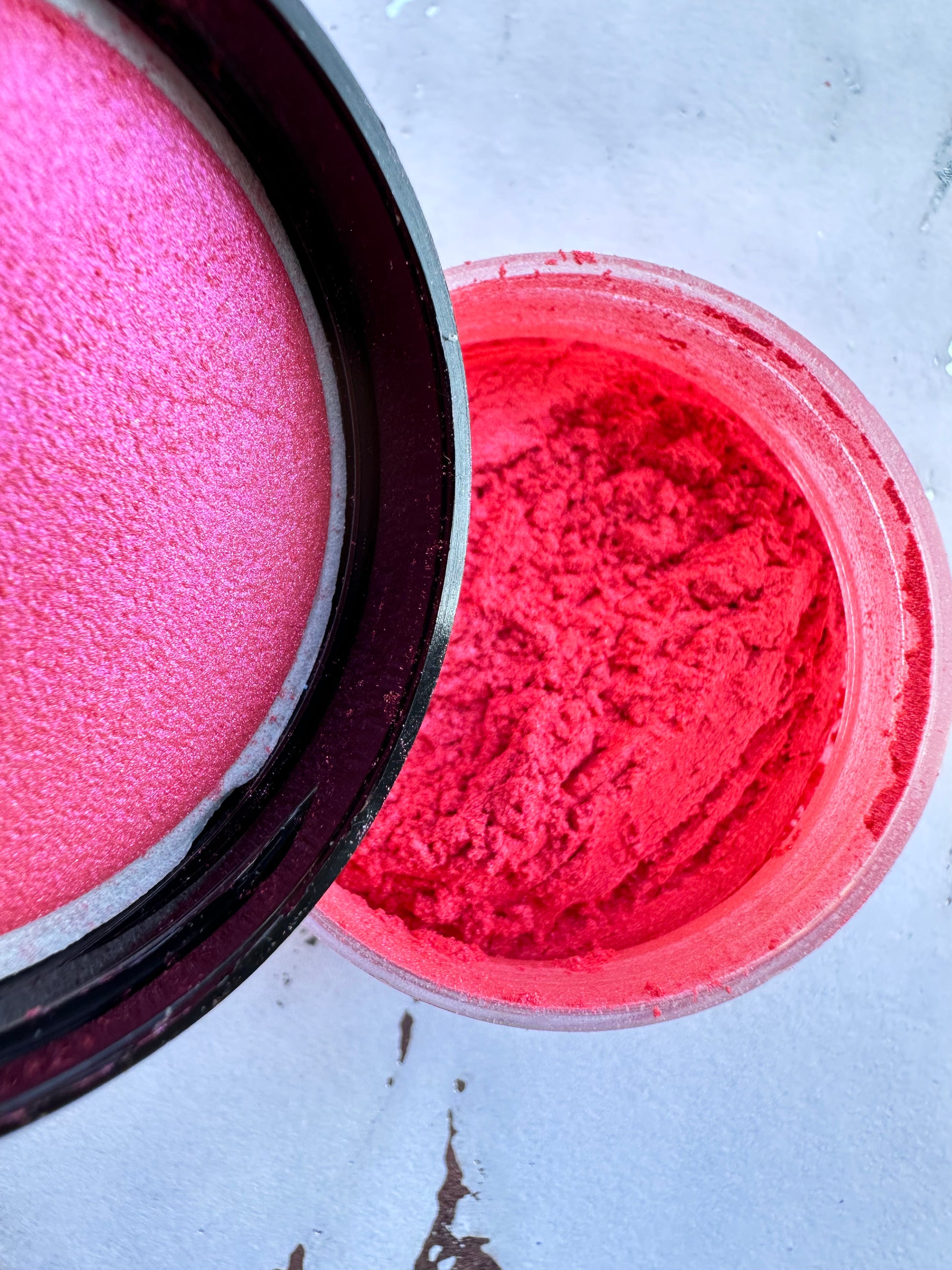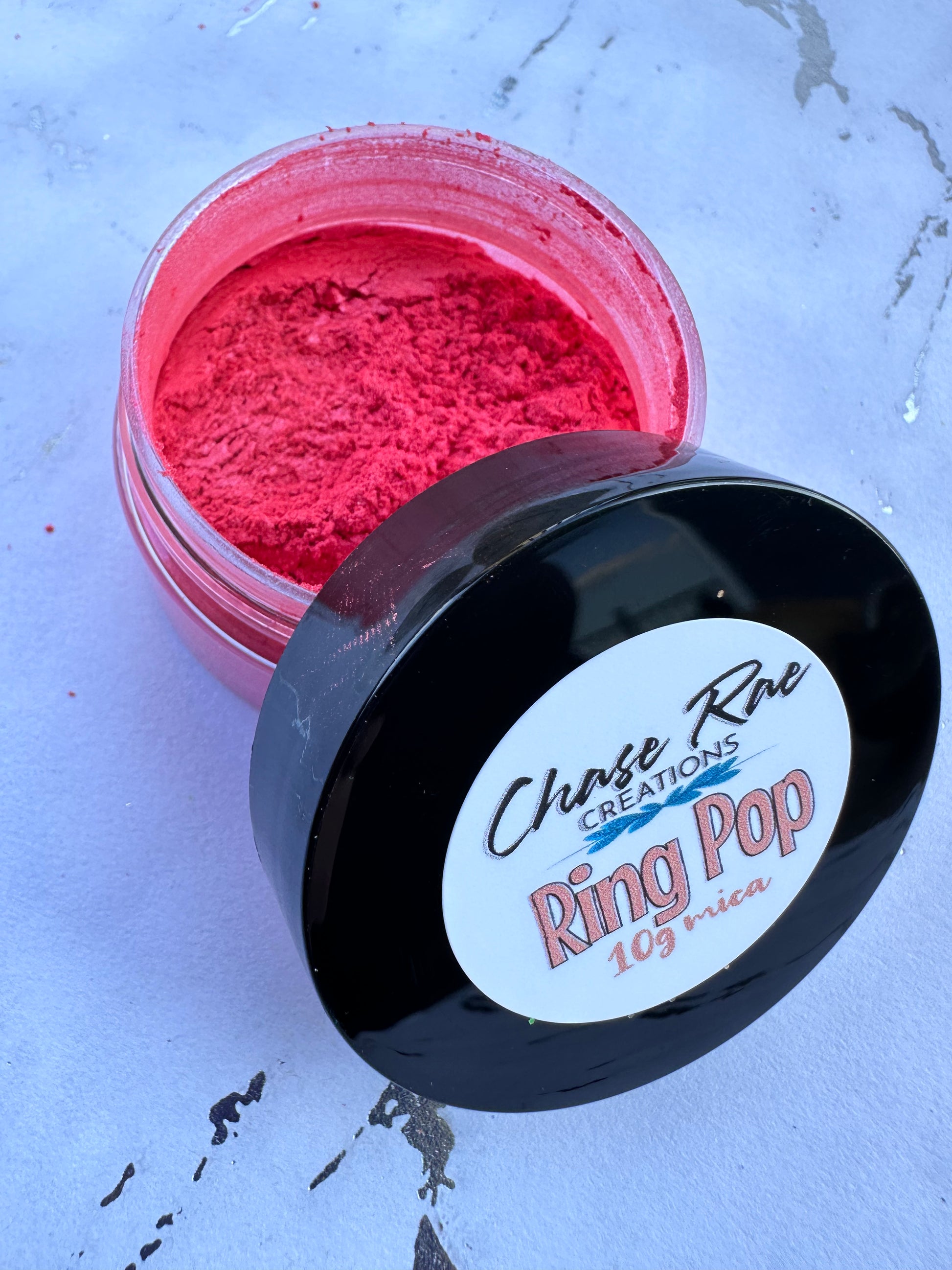 Ring Pop is a gorgeous, coral /red pearl mica powder with a pink shimmer.