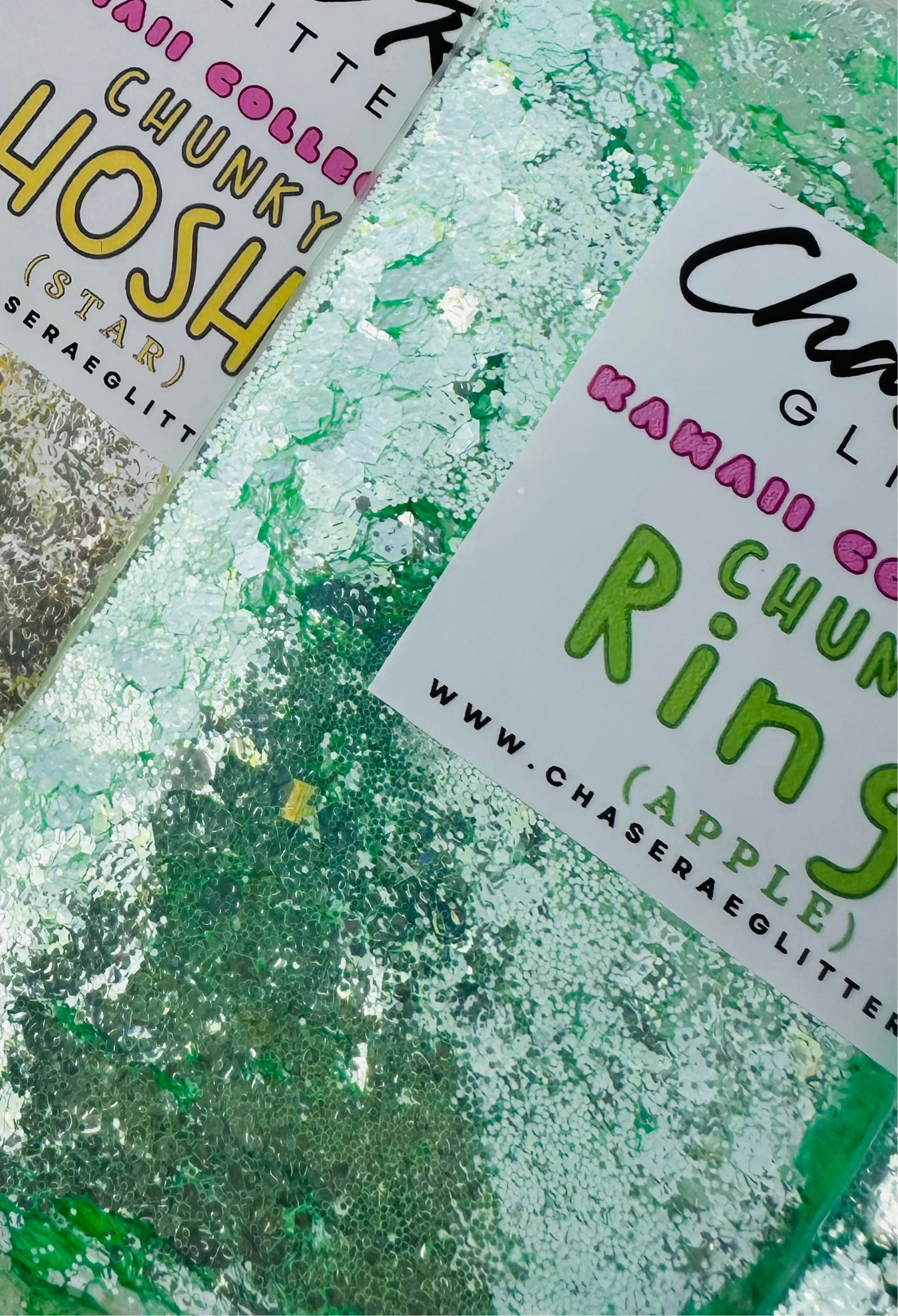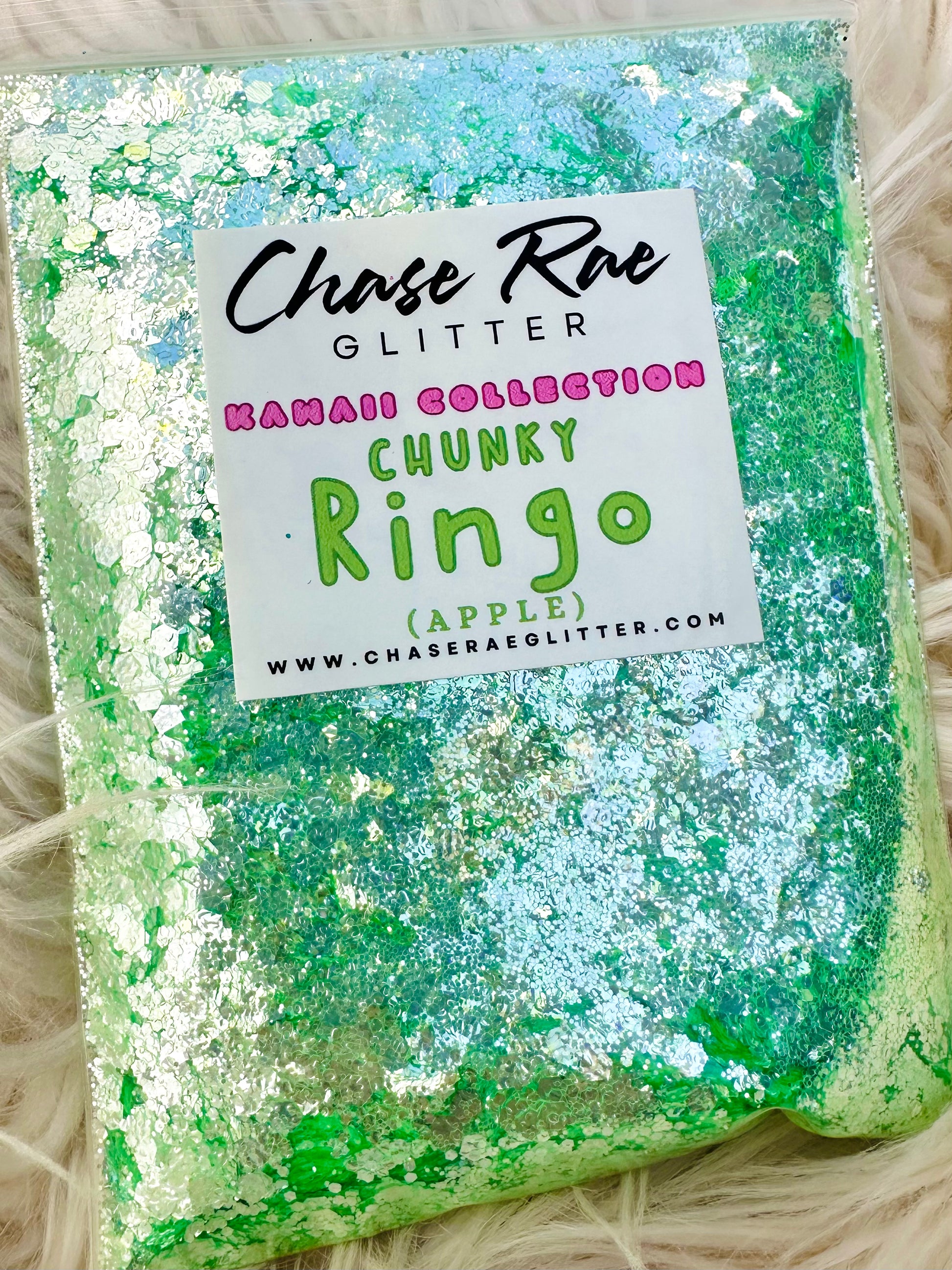 Ringo is a superior, high sparkle, glitter. The cutest bright green color, and sparkles like specks of diamonds. Has a mirror effect. Part of the Kawaii Collection