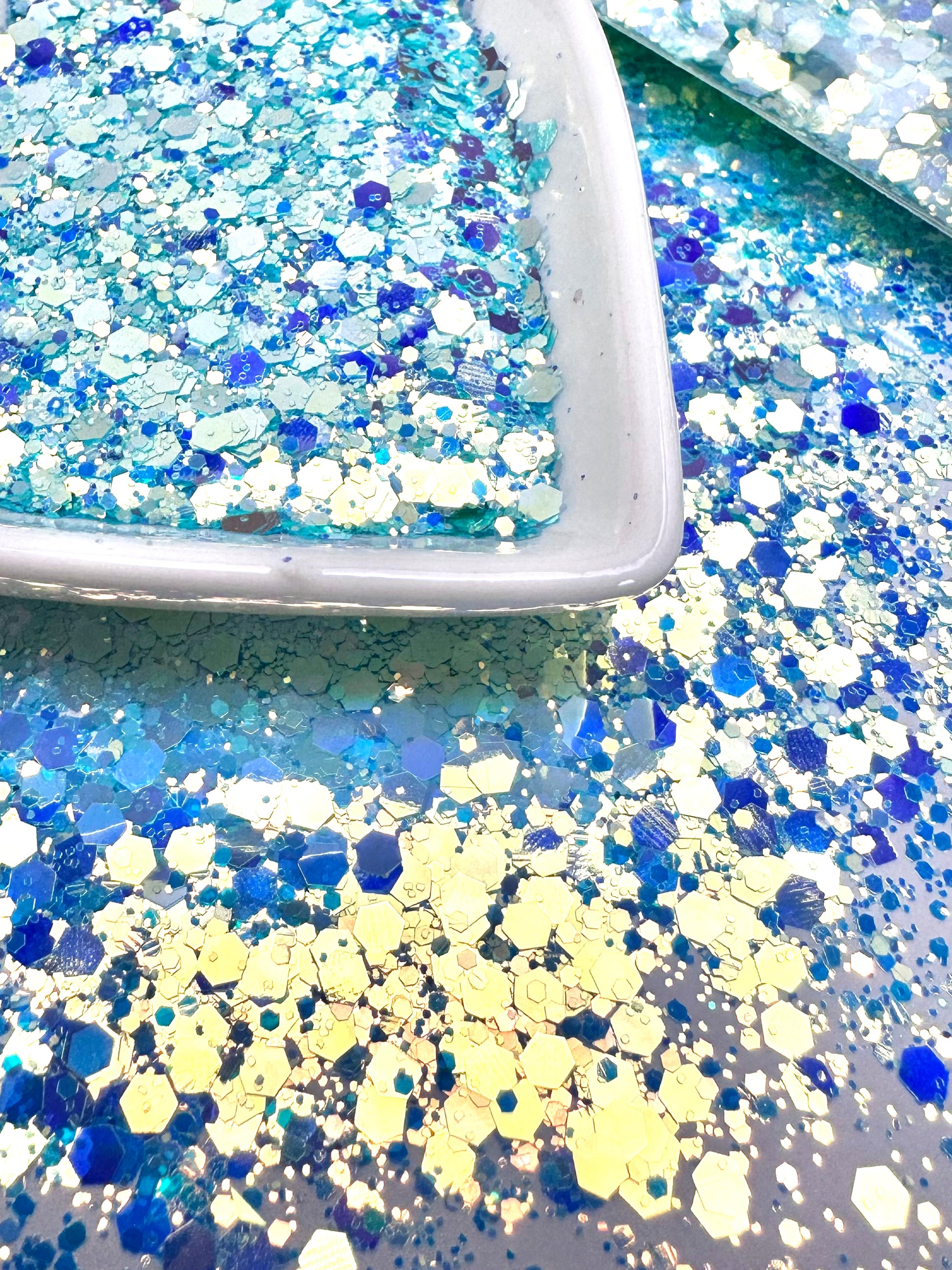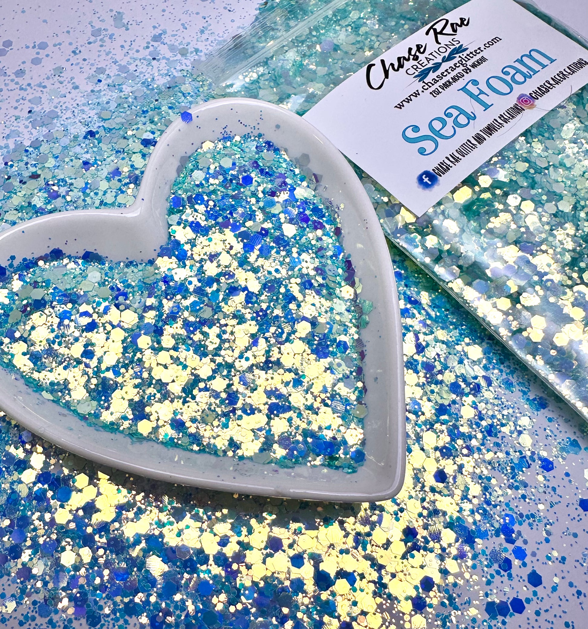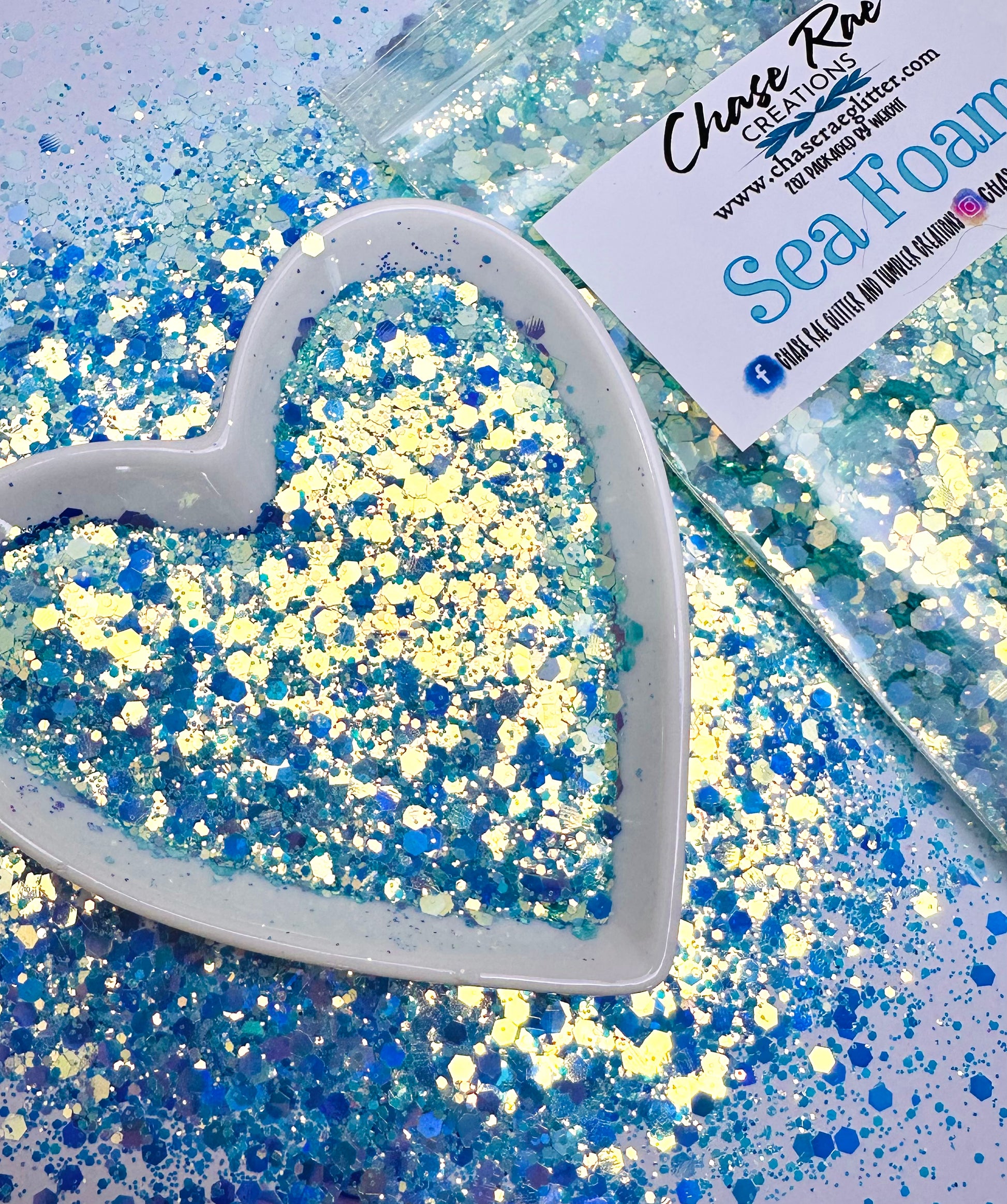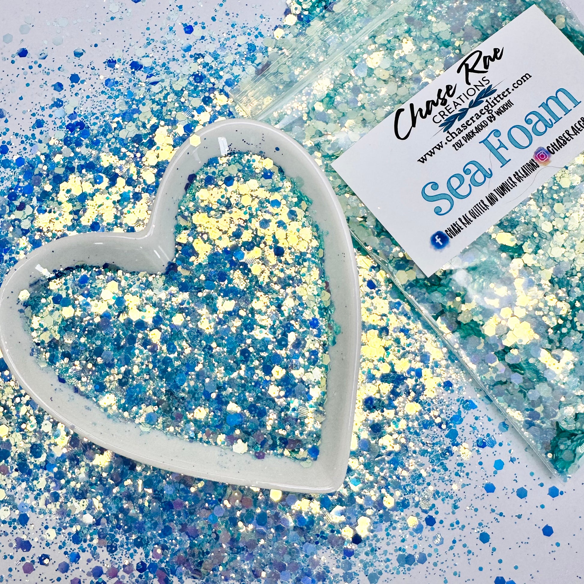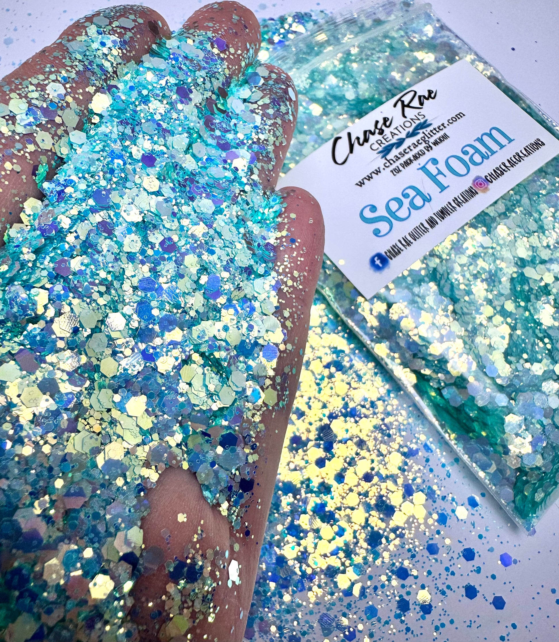 Sea Foam is a high sparkling, teal, iridescent glitter.