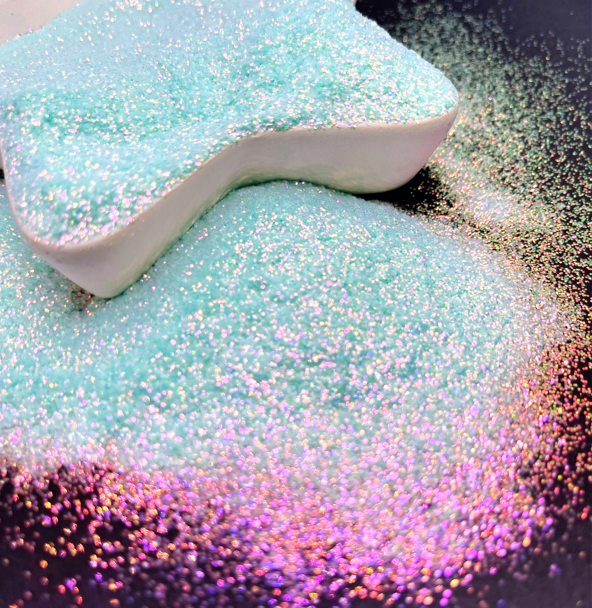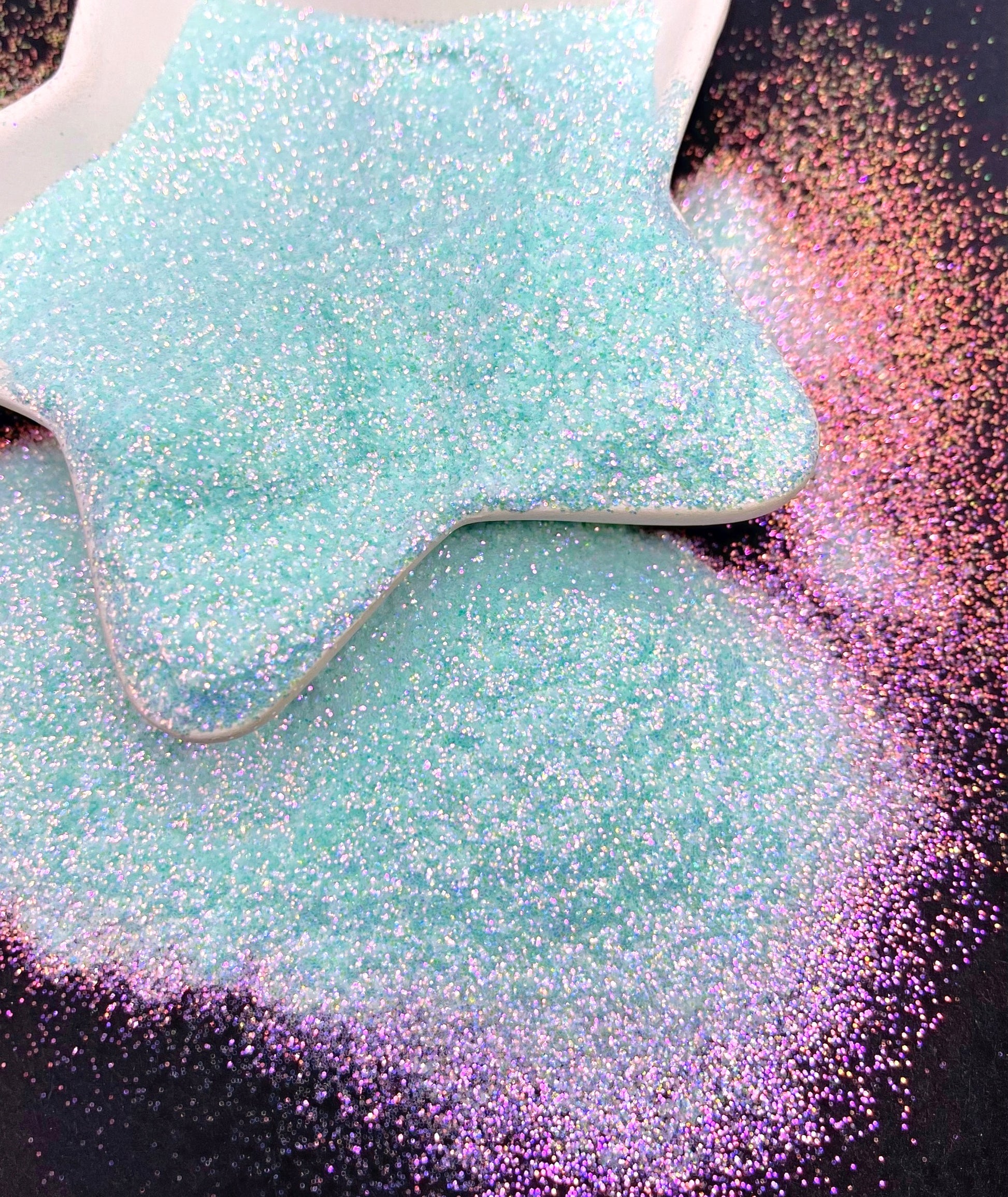 Serenade is a gorgeous soft blue glitter. Iridescent, and semi translucent with a pink undertone.
