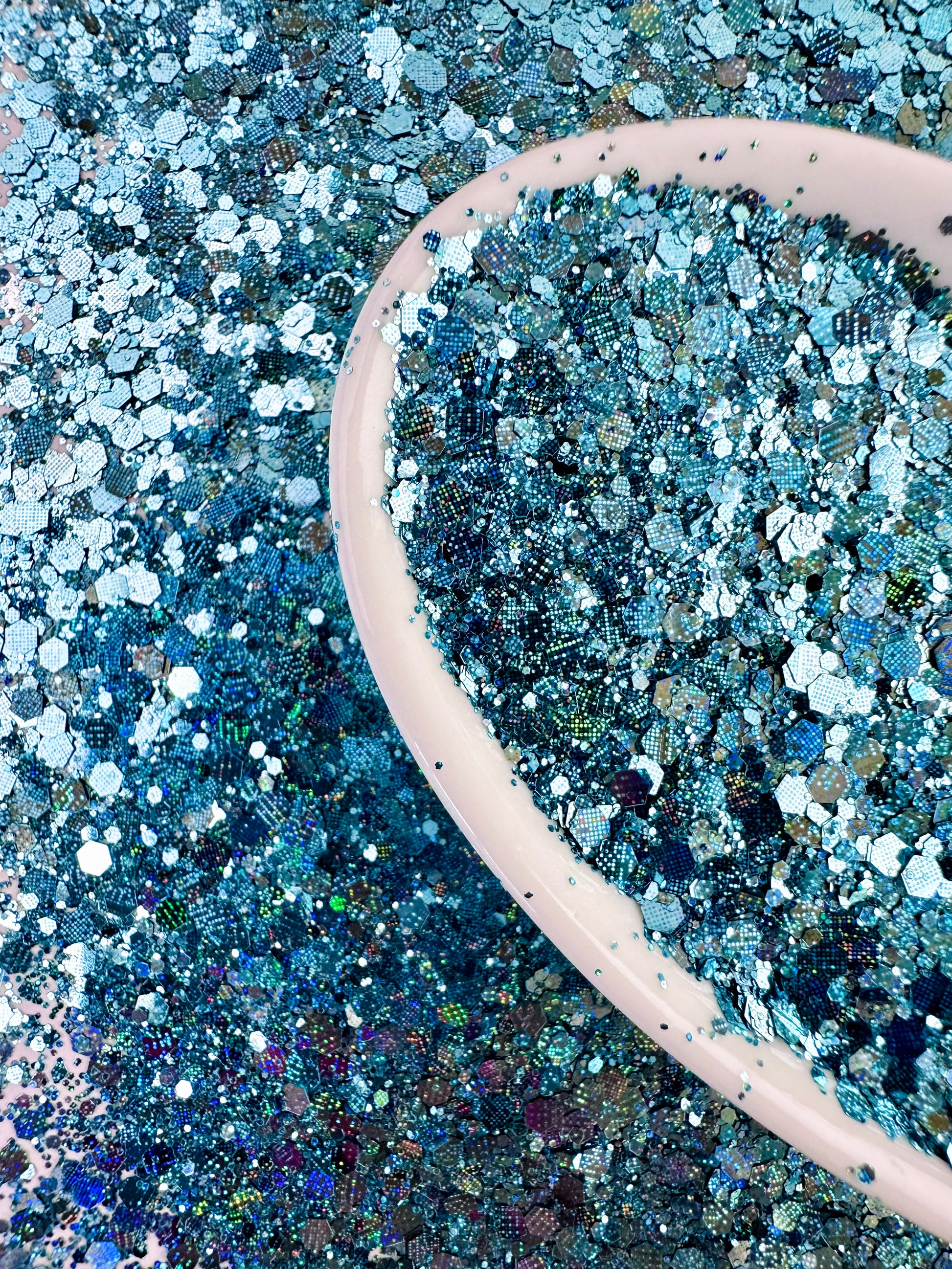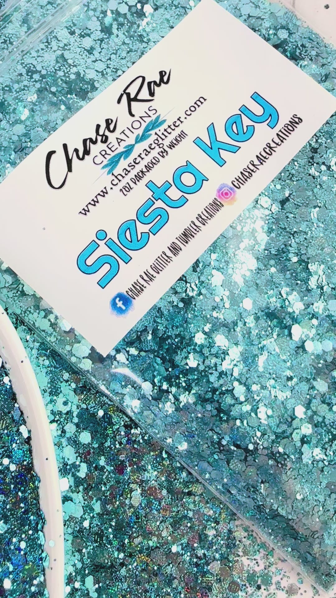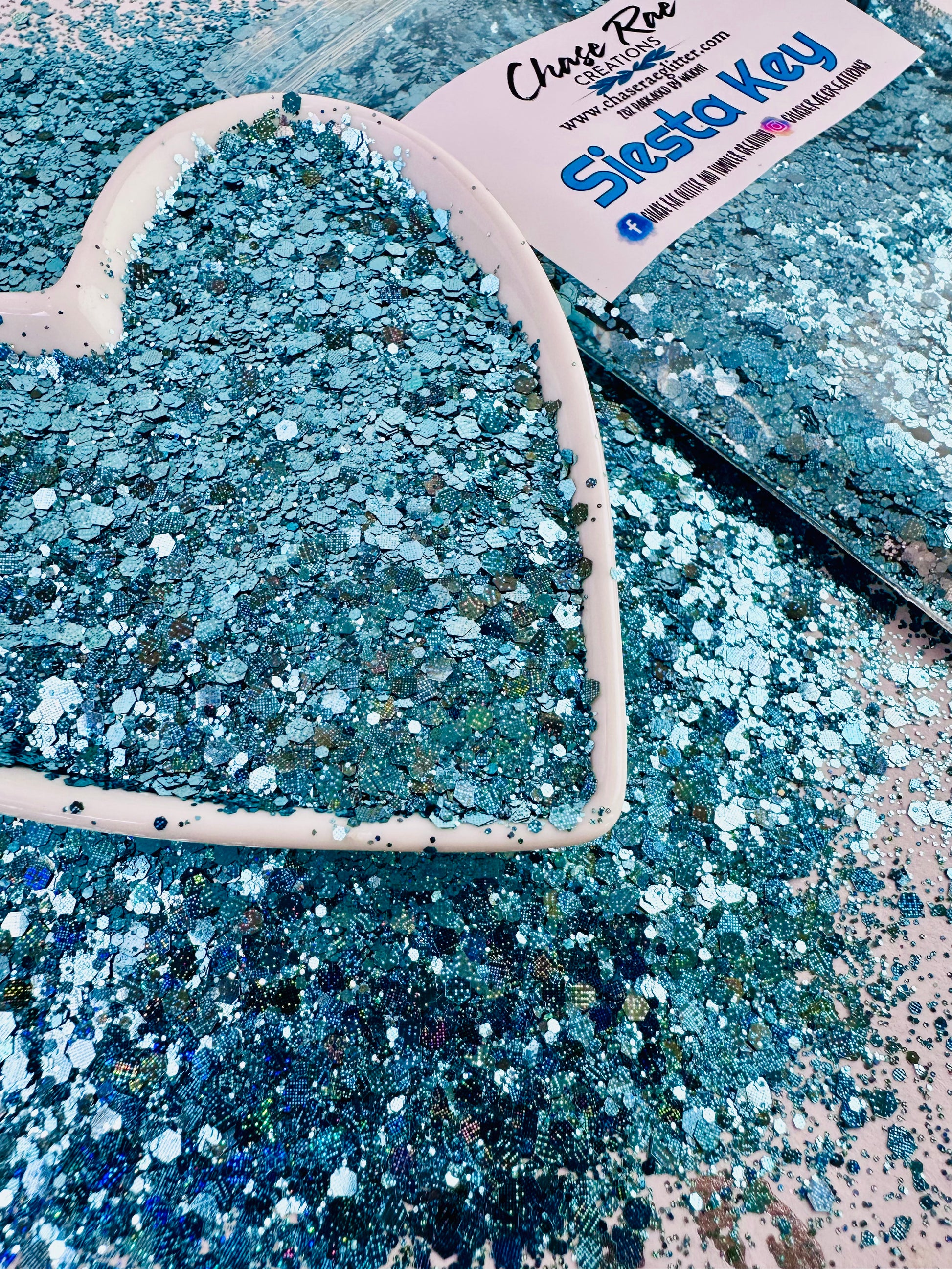 Siesta Key is a holographic chunky mix. Light turquoise in color. Notice how each piece looks to be texturized! Yet extremely soft.