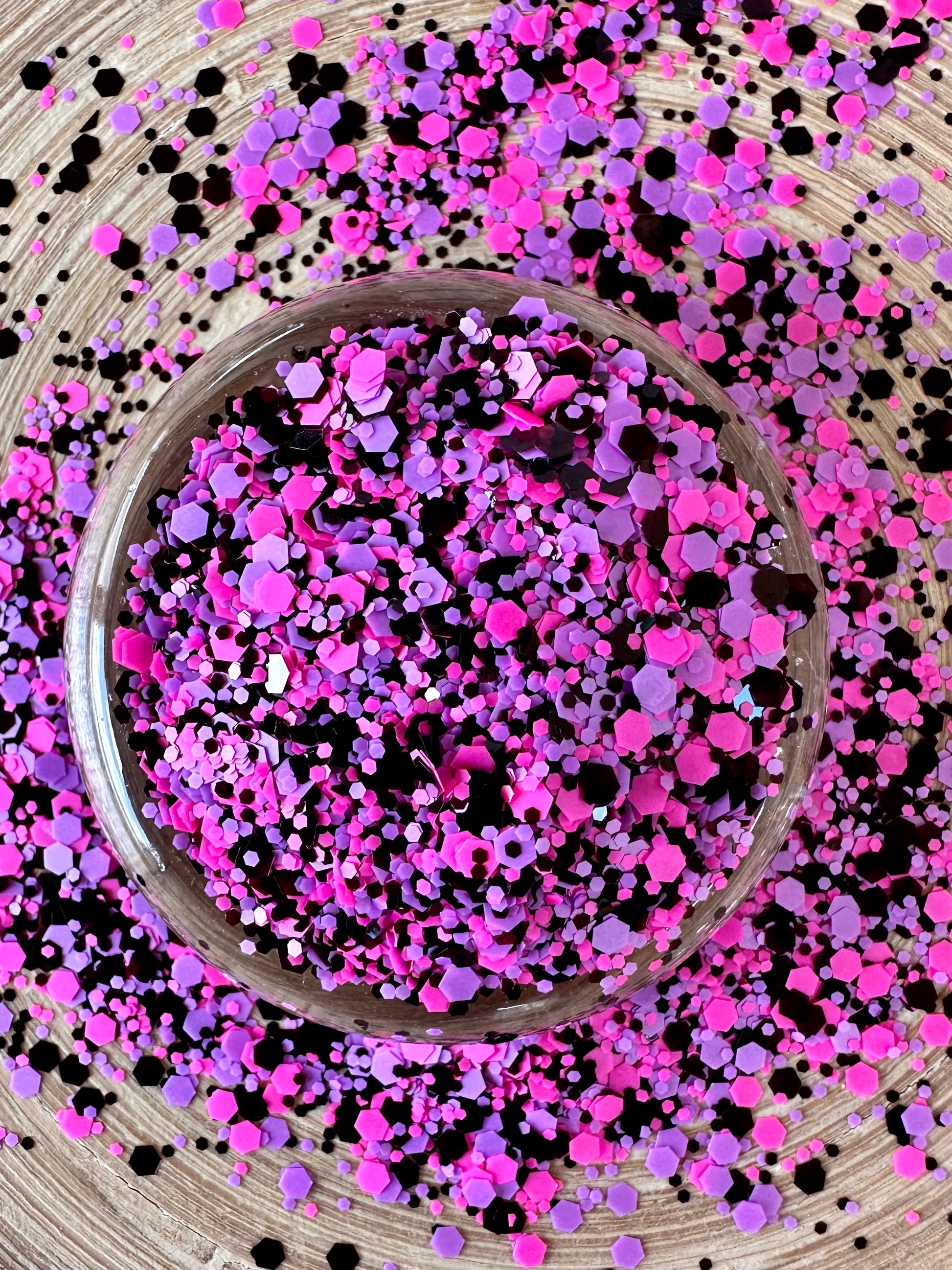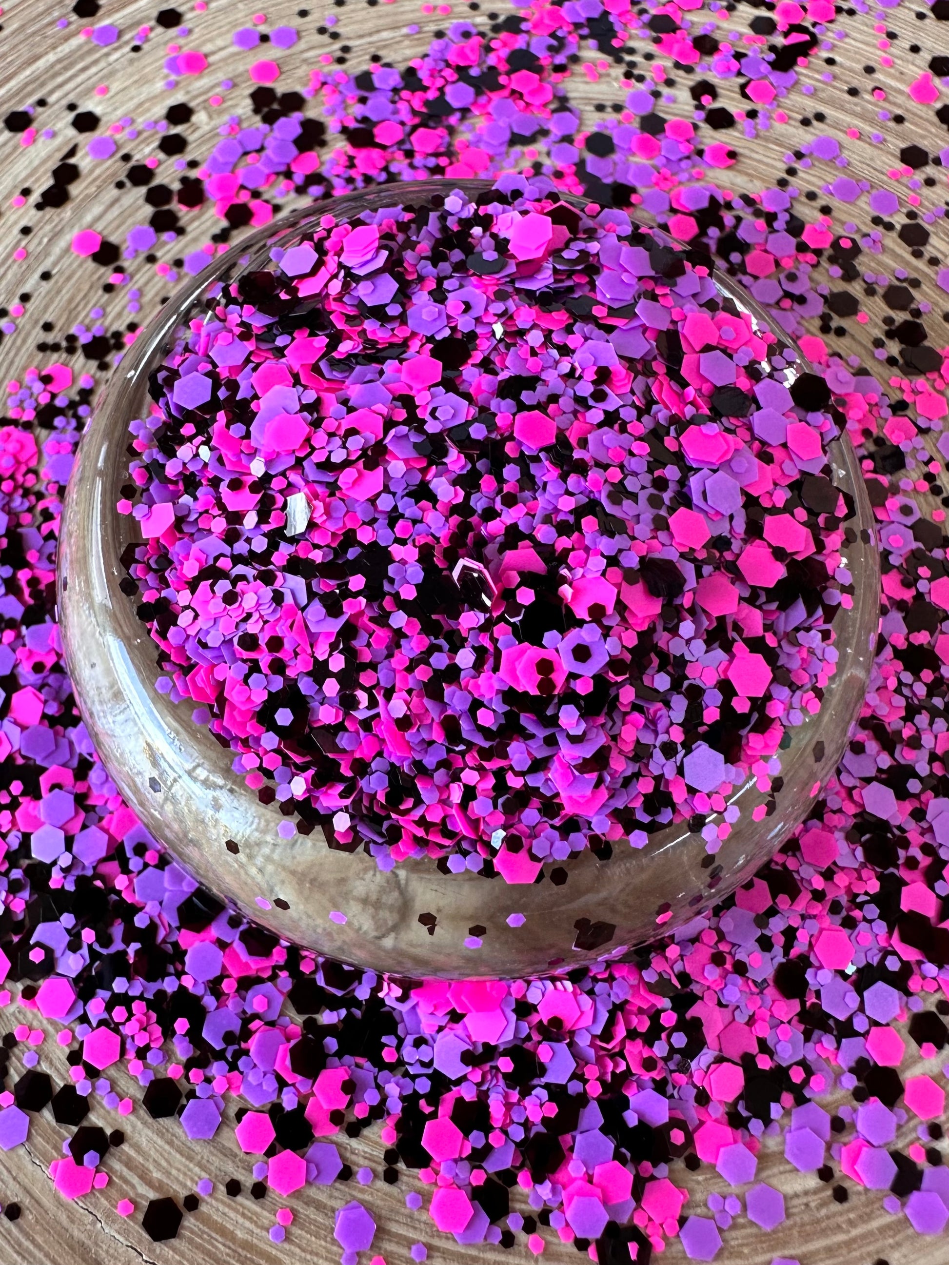 Spectra is a fun chunky mix of black, purple and hot pink. Solid color with a pearl sheen.