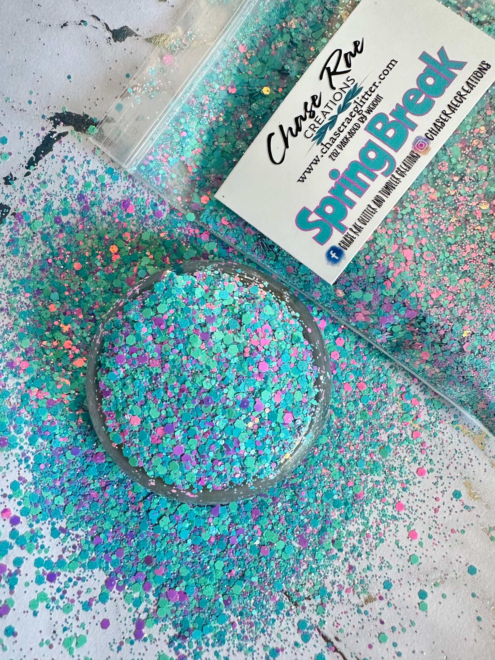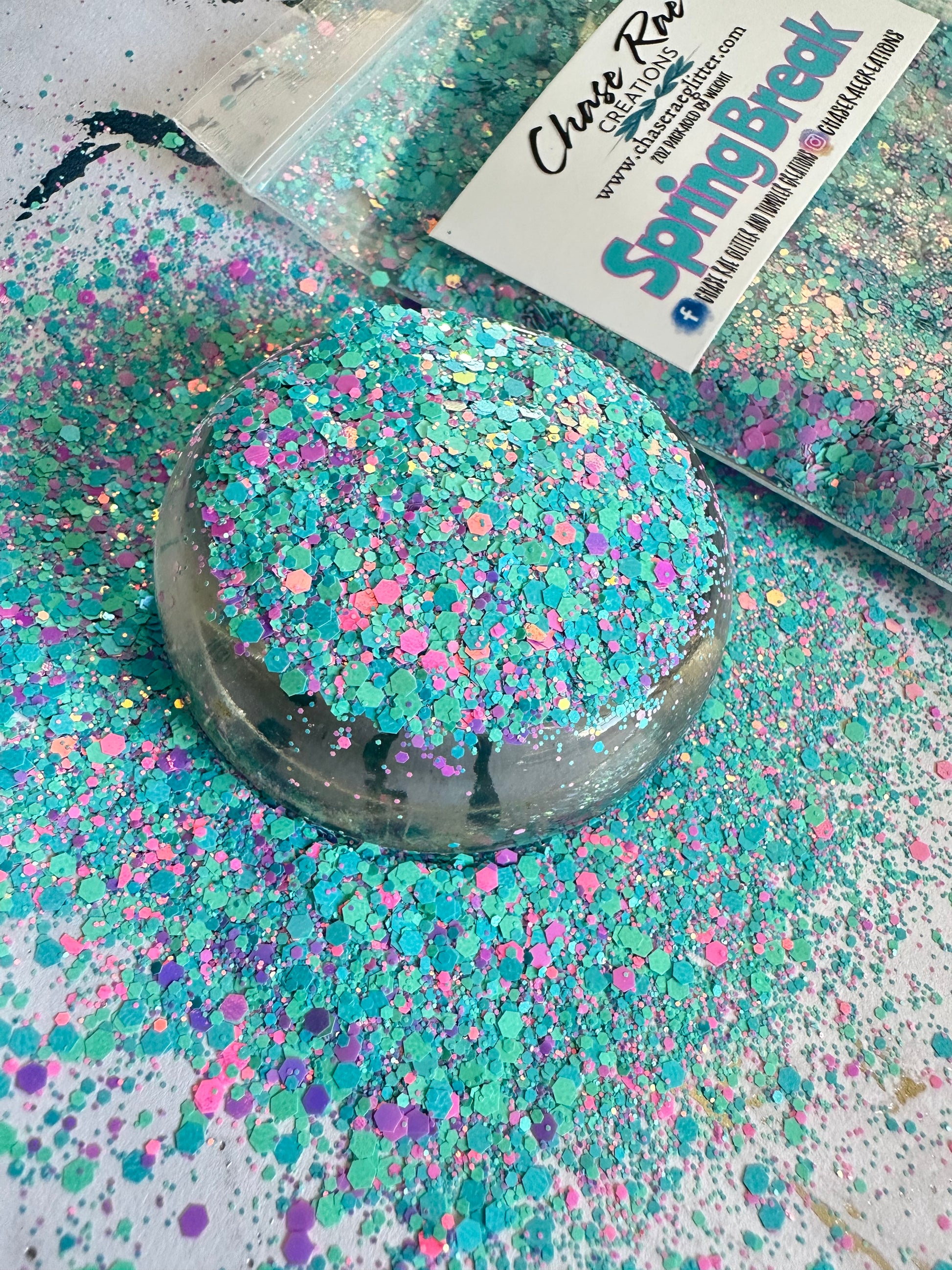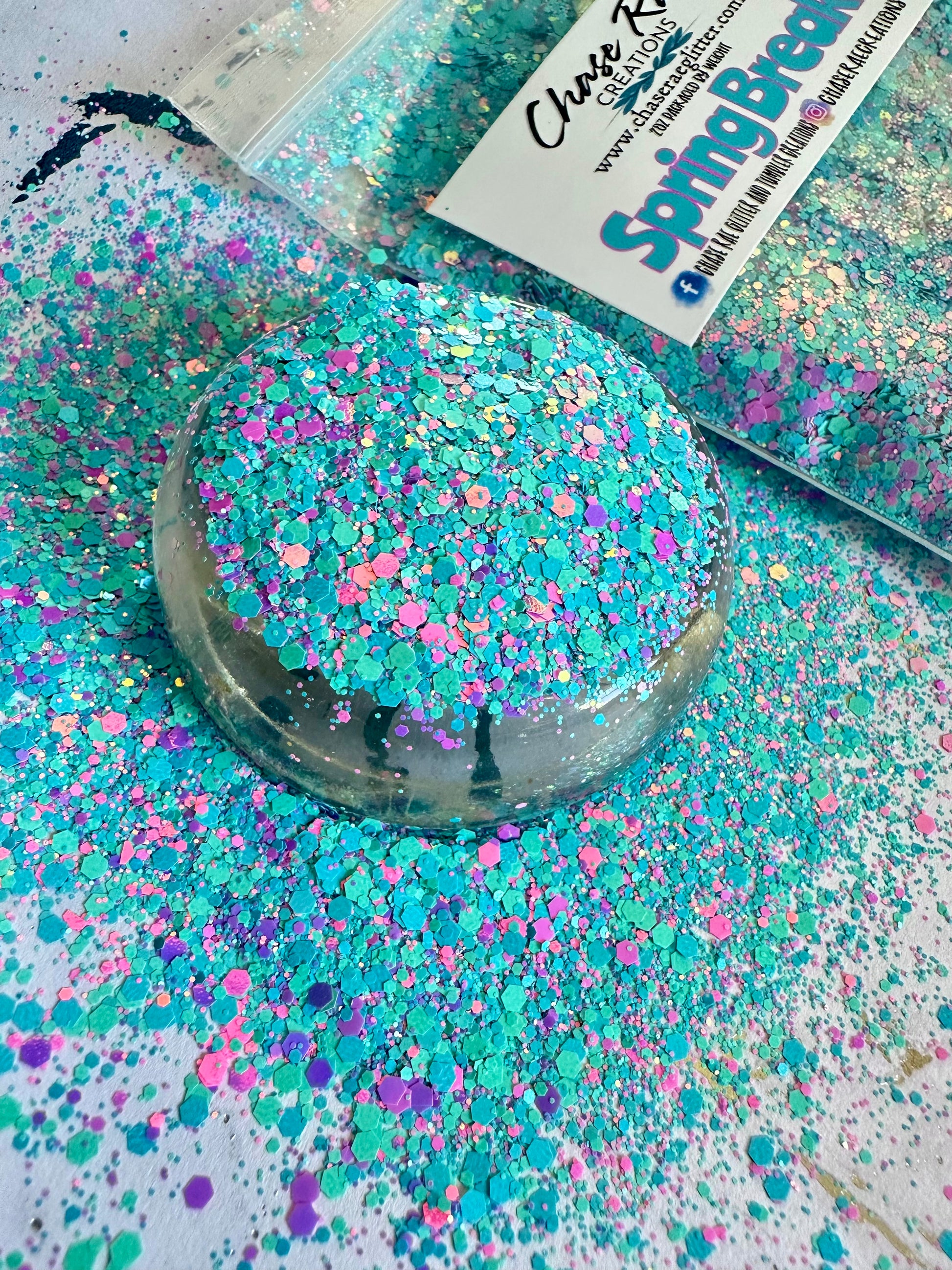 This semi chunky mix is perfect for Spring or Summer! Spring Break is a mix of teals, pink, and purple. All solid colors. Non-translucent.