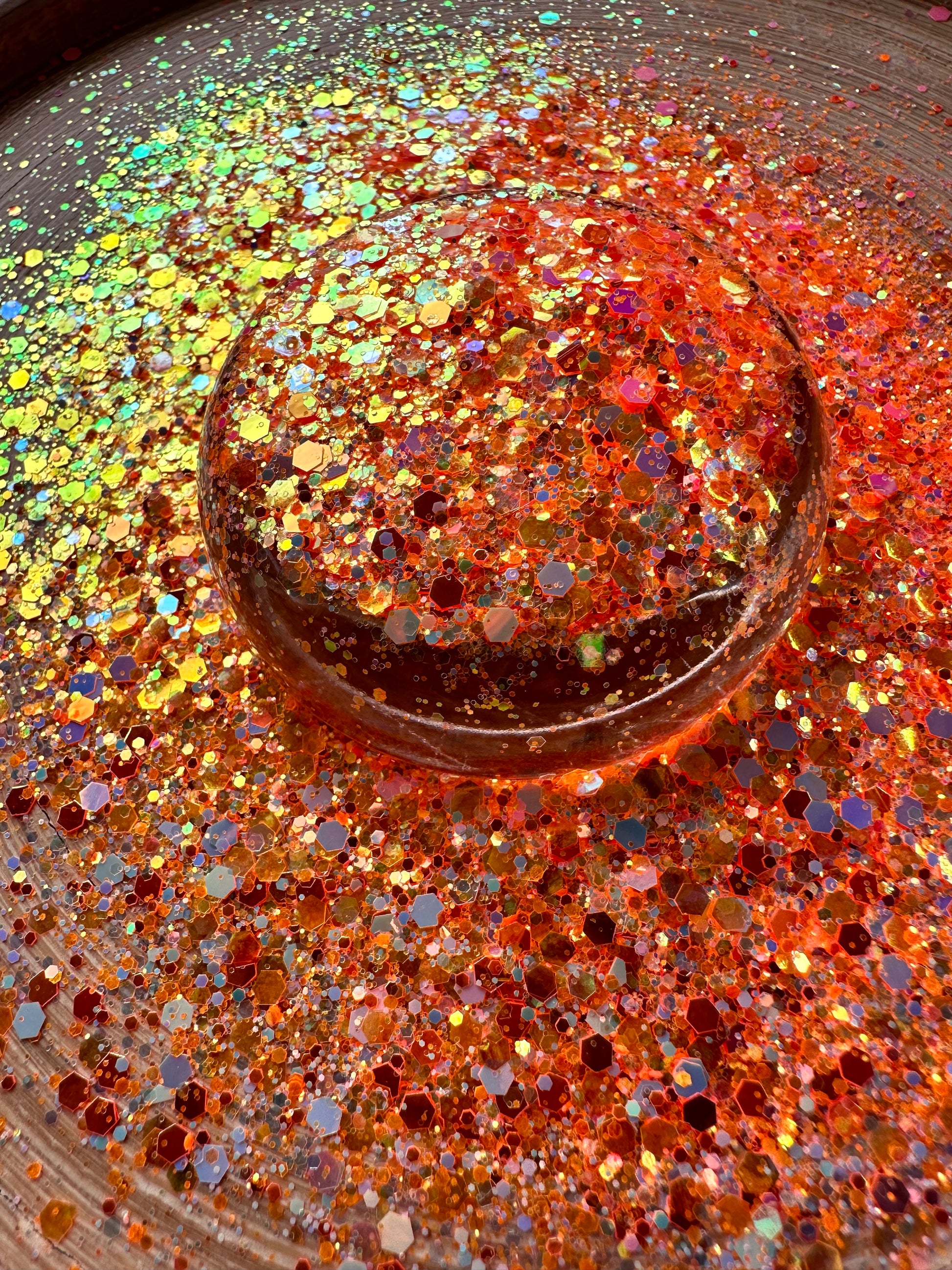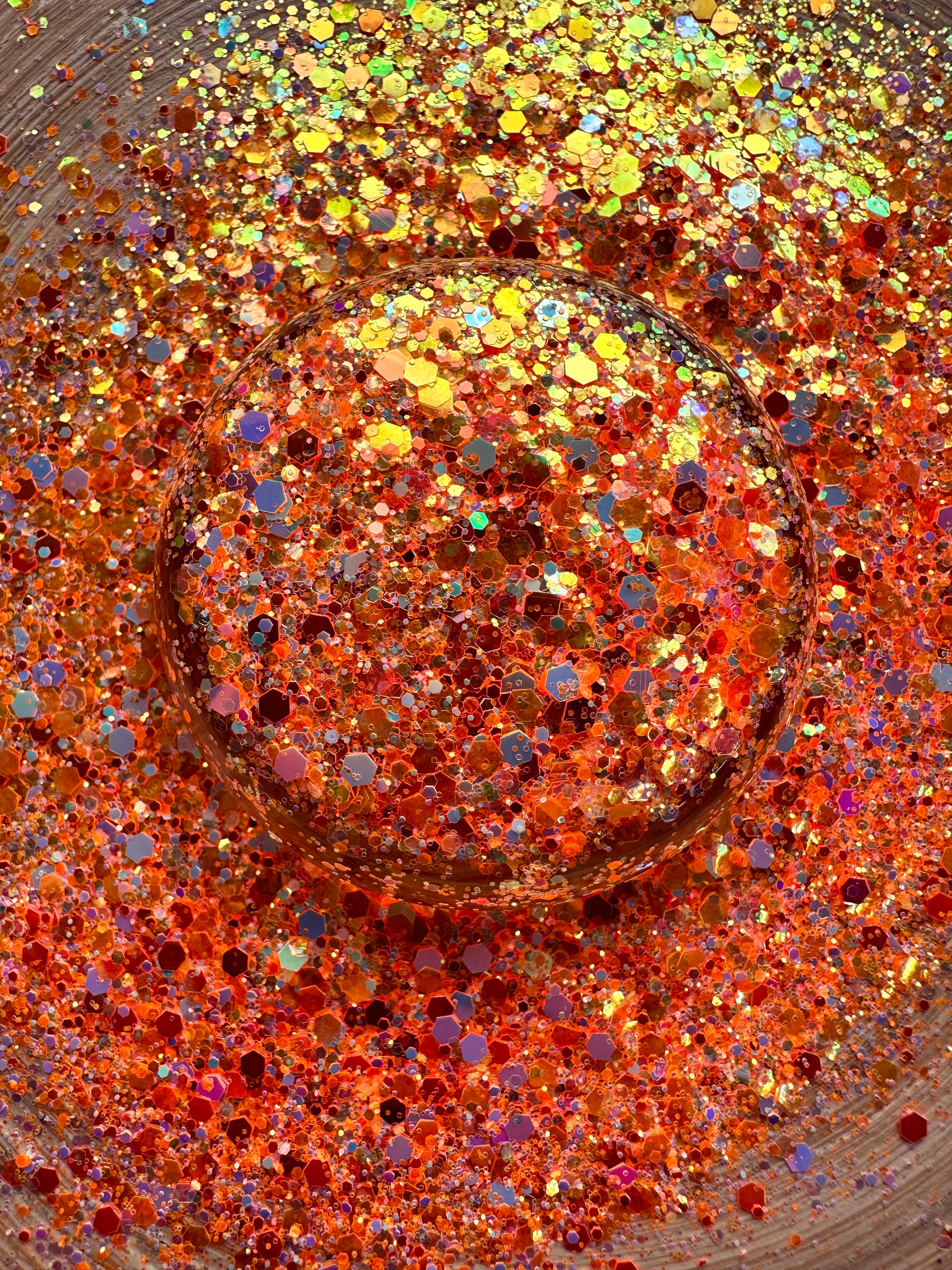 Sprite is a gorgeous glow in the dark orange Chunky mix. High sparkle with semi-translucent and mirror pieces.