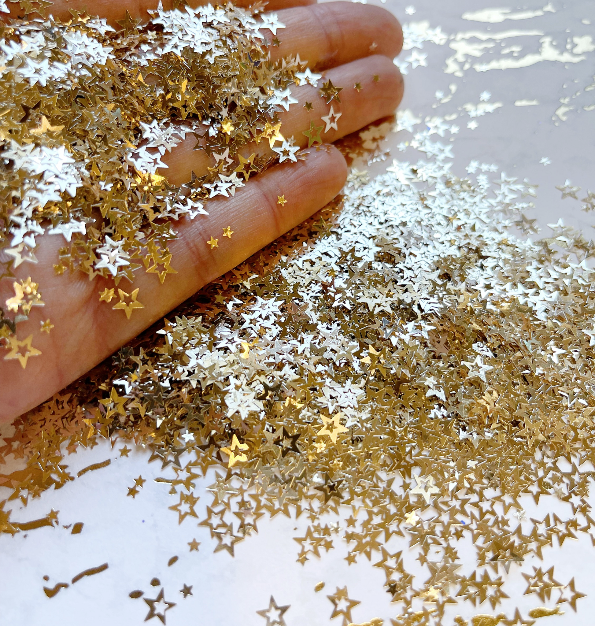 Starla is a mix of stars in different sizes. Some hollow, some not. Metallic gold.