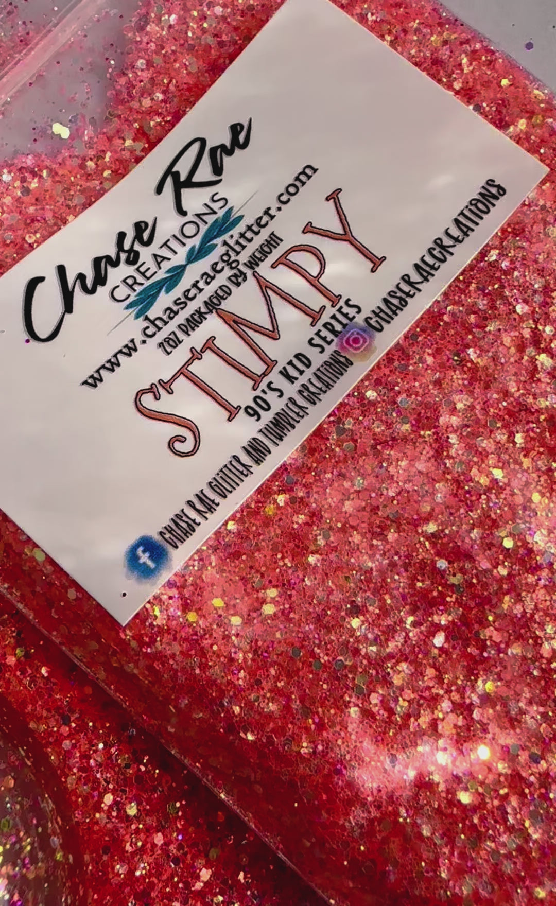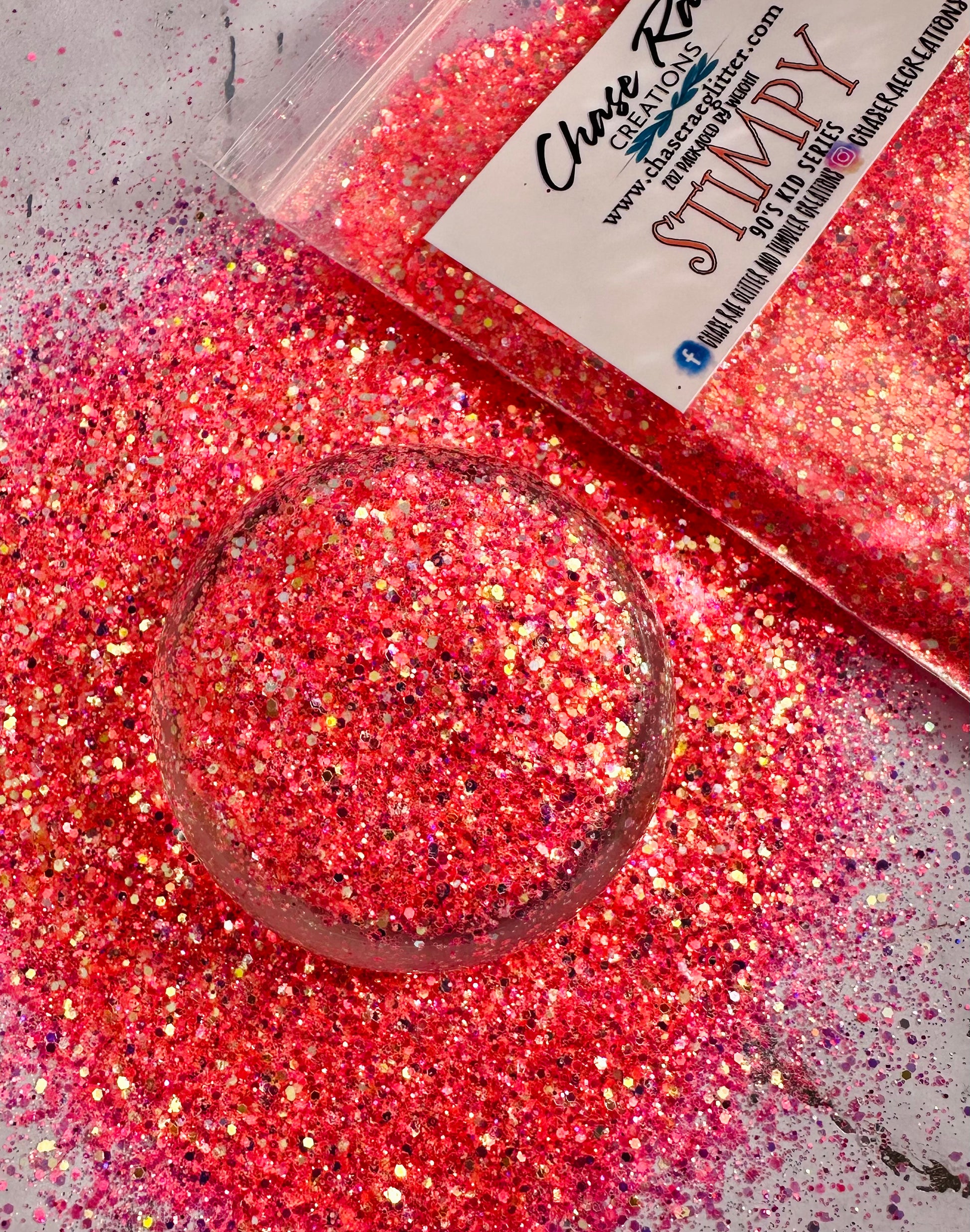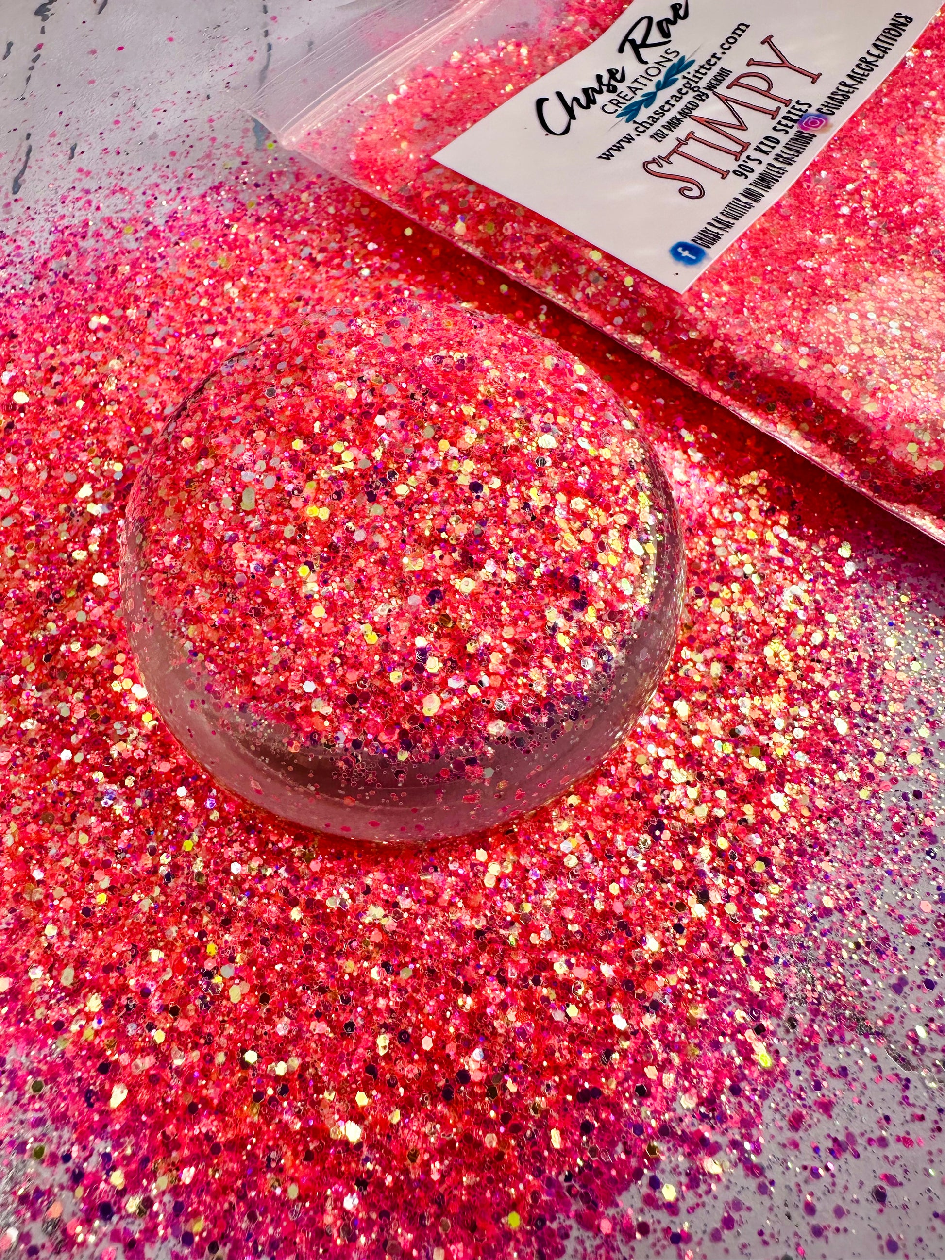 Stimpy is a bright, iridescent coral /orange glitter. A Bright and fun neon glitter with mirror pieces mixed in.