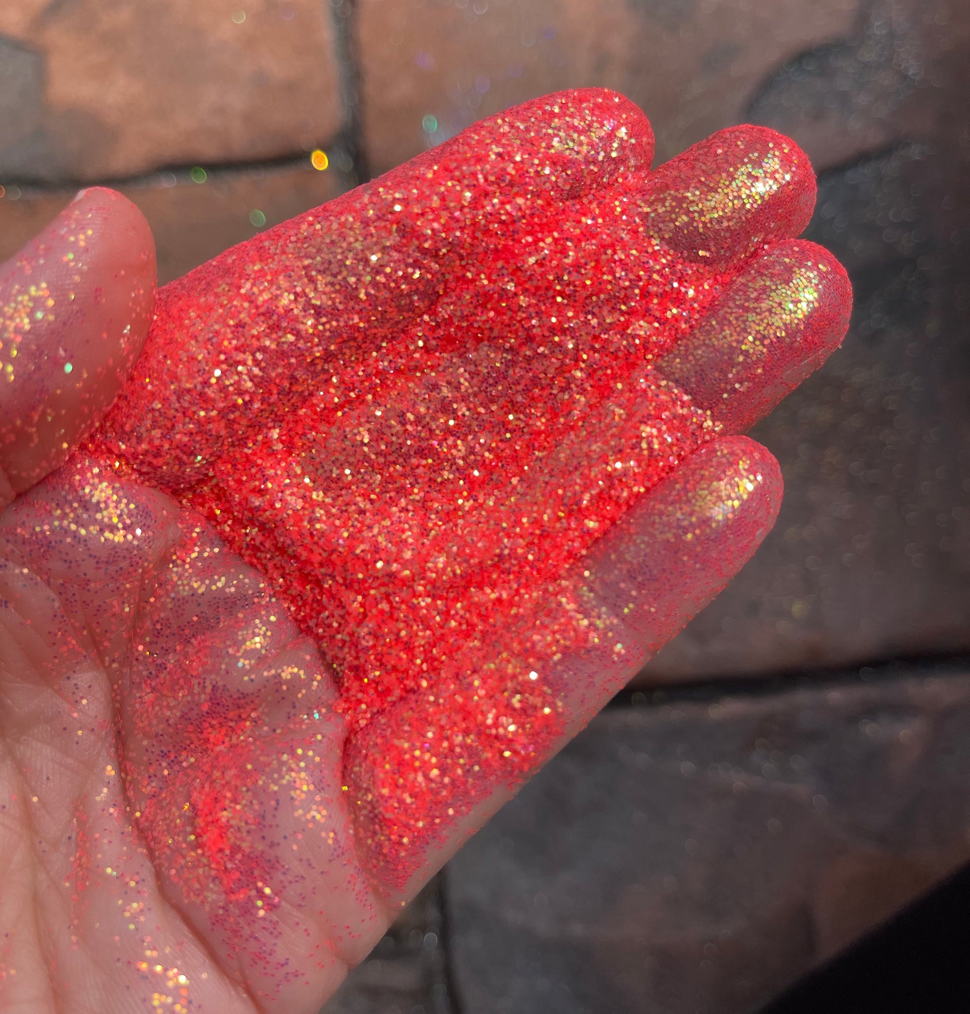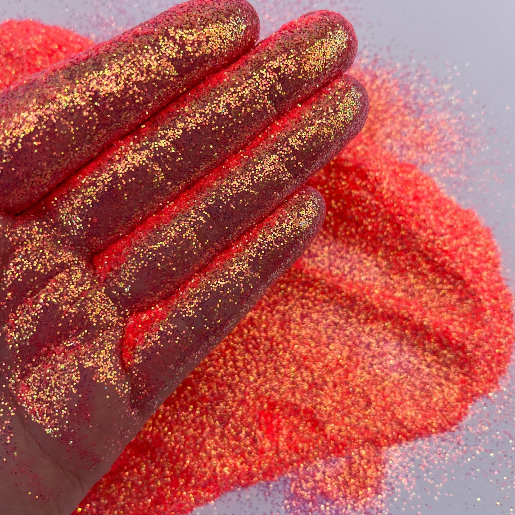 Sun Kissed is a gorgeous iridescent bright coral / orange glitter.