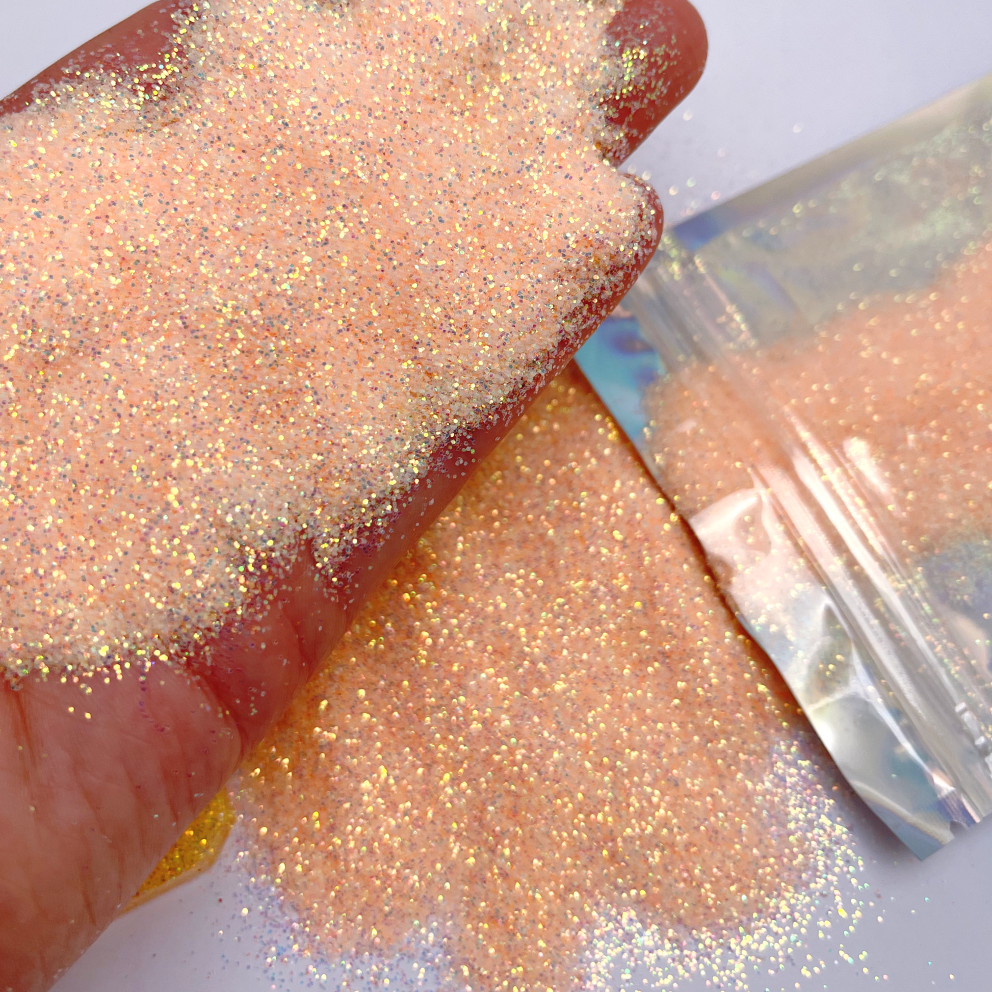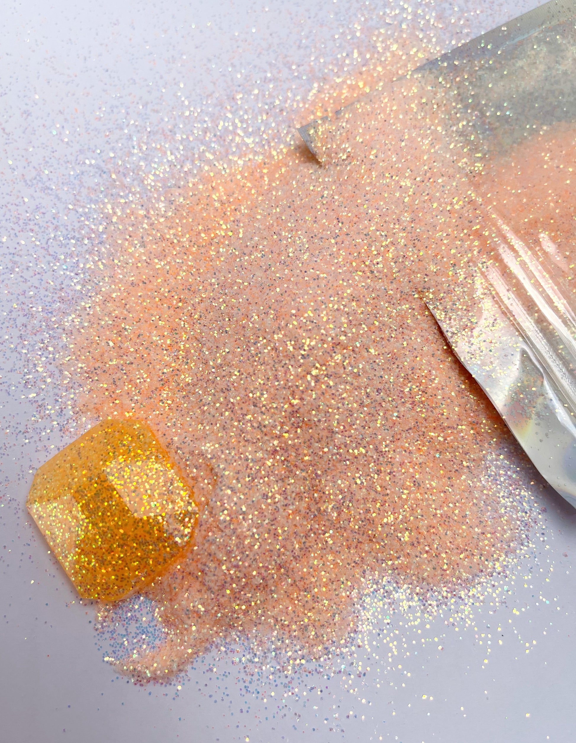 Taffy is an iridescent, pastel orange. Semi-translucent and high sparkle.