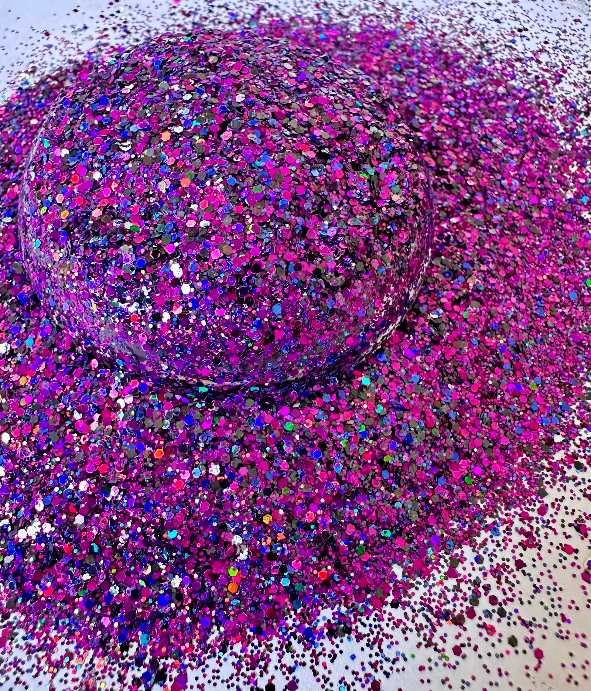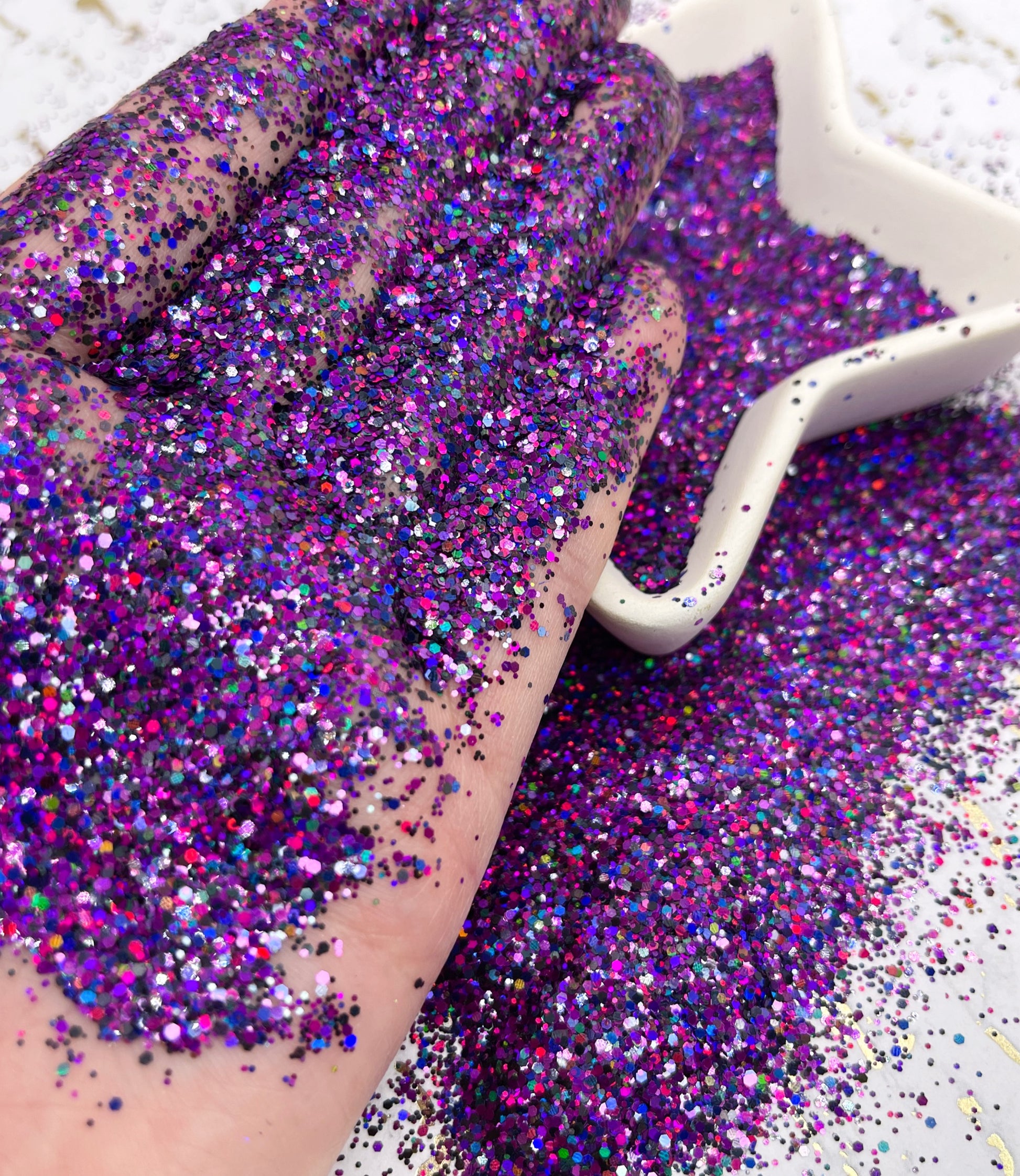 Tarot is a holographic, purple mini chunky mix! Purples, magenta, and black.