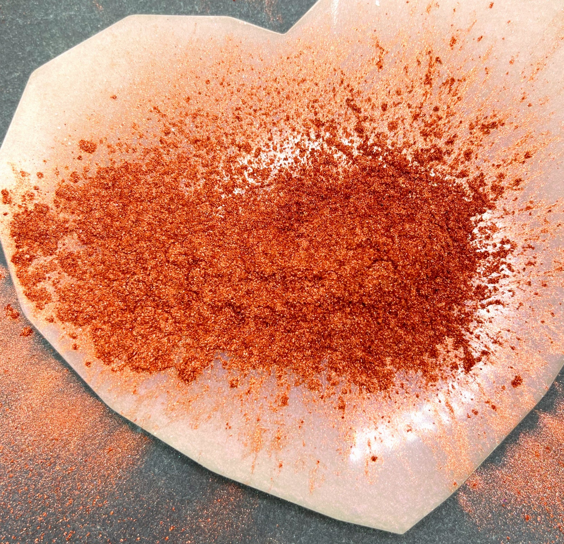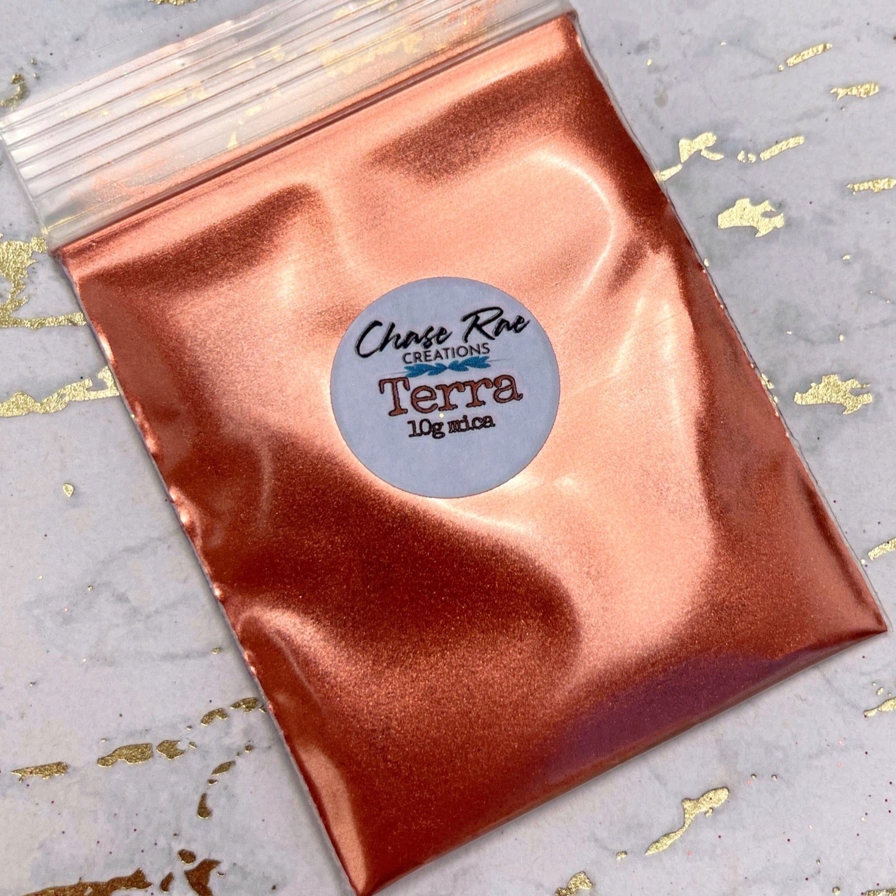 Terra is a gorgeous, warm Terra Cotta colored mica powder. Pearlescent shimmer.
