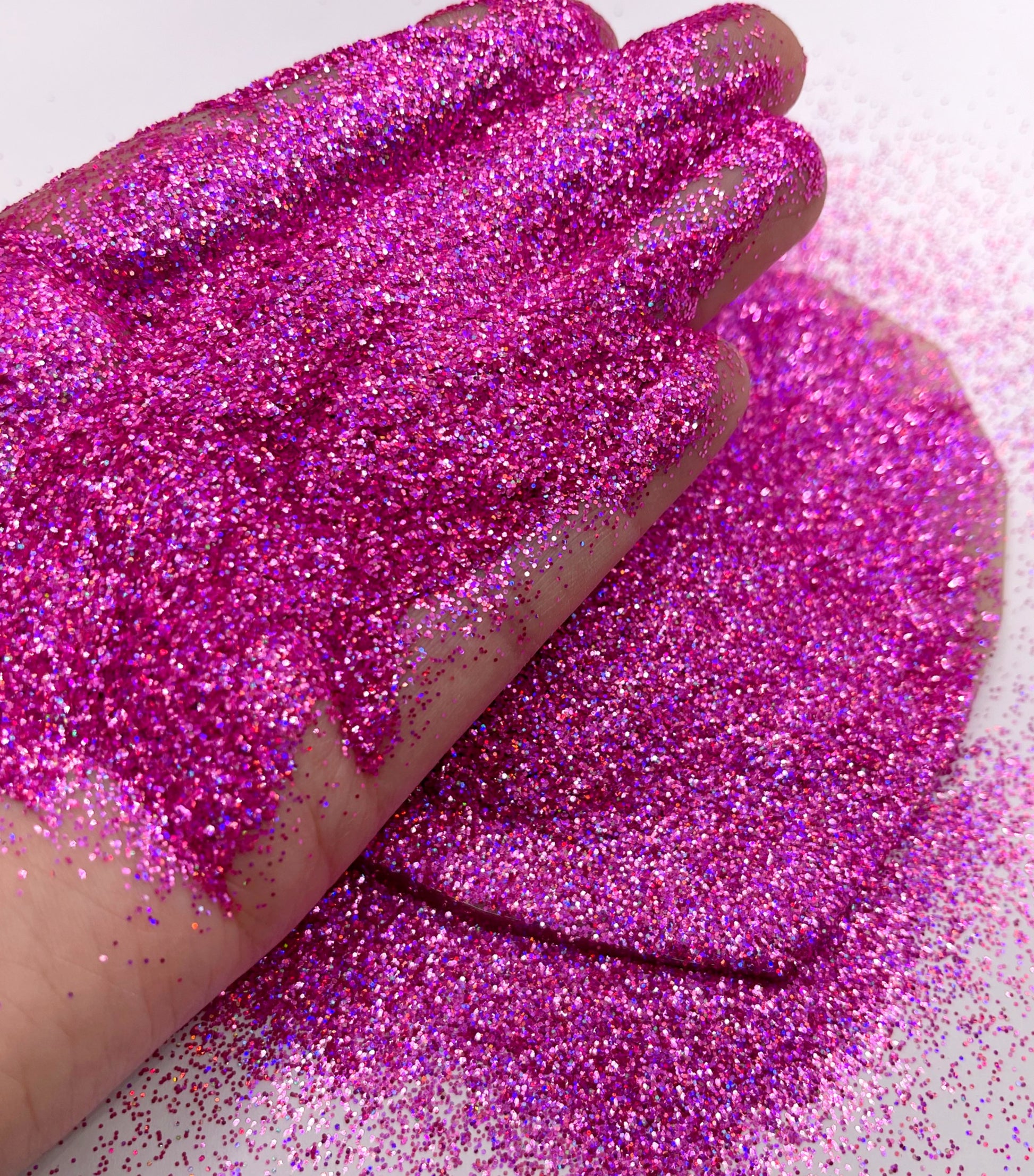 Tickled Jr. is a bright pink holographic glitter. Also can be purchased in Chunky!