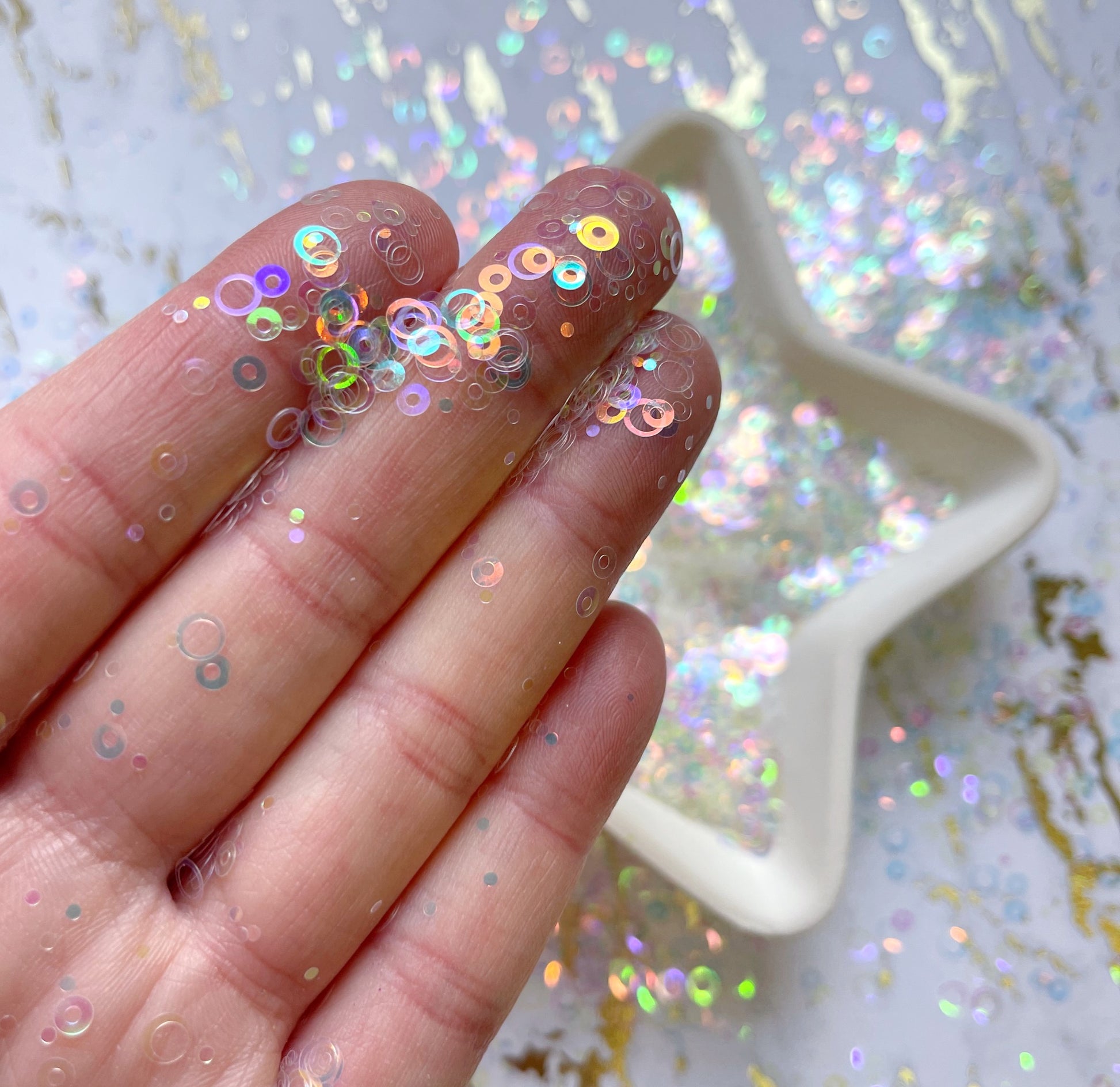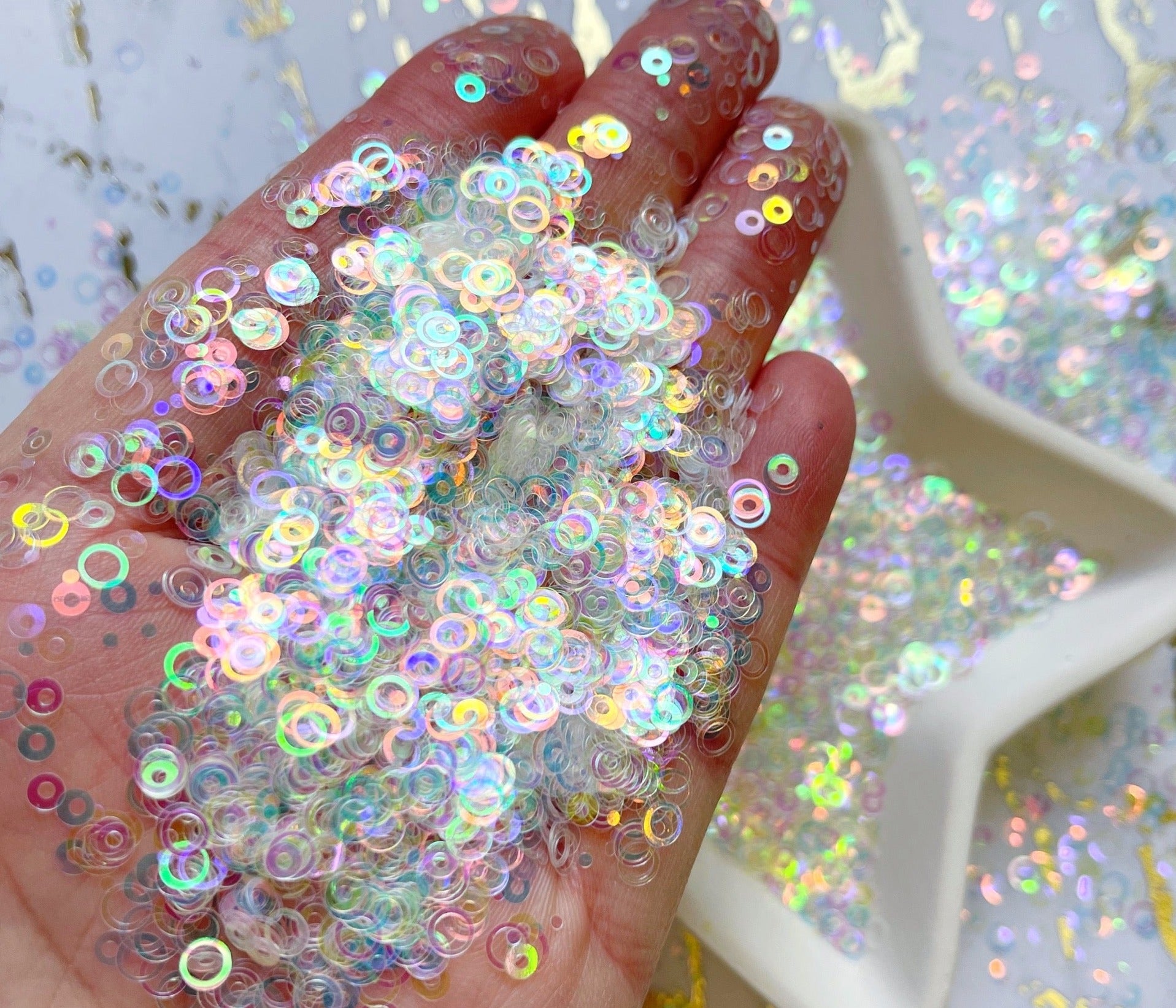Iridescent hollow circles. Multiple sizes. These are perfect for those finishing touches or in a Snow globe tumbler!