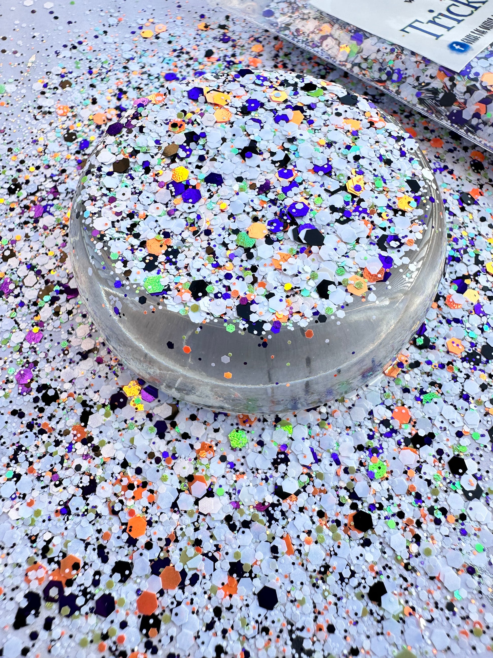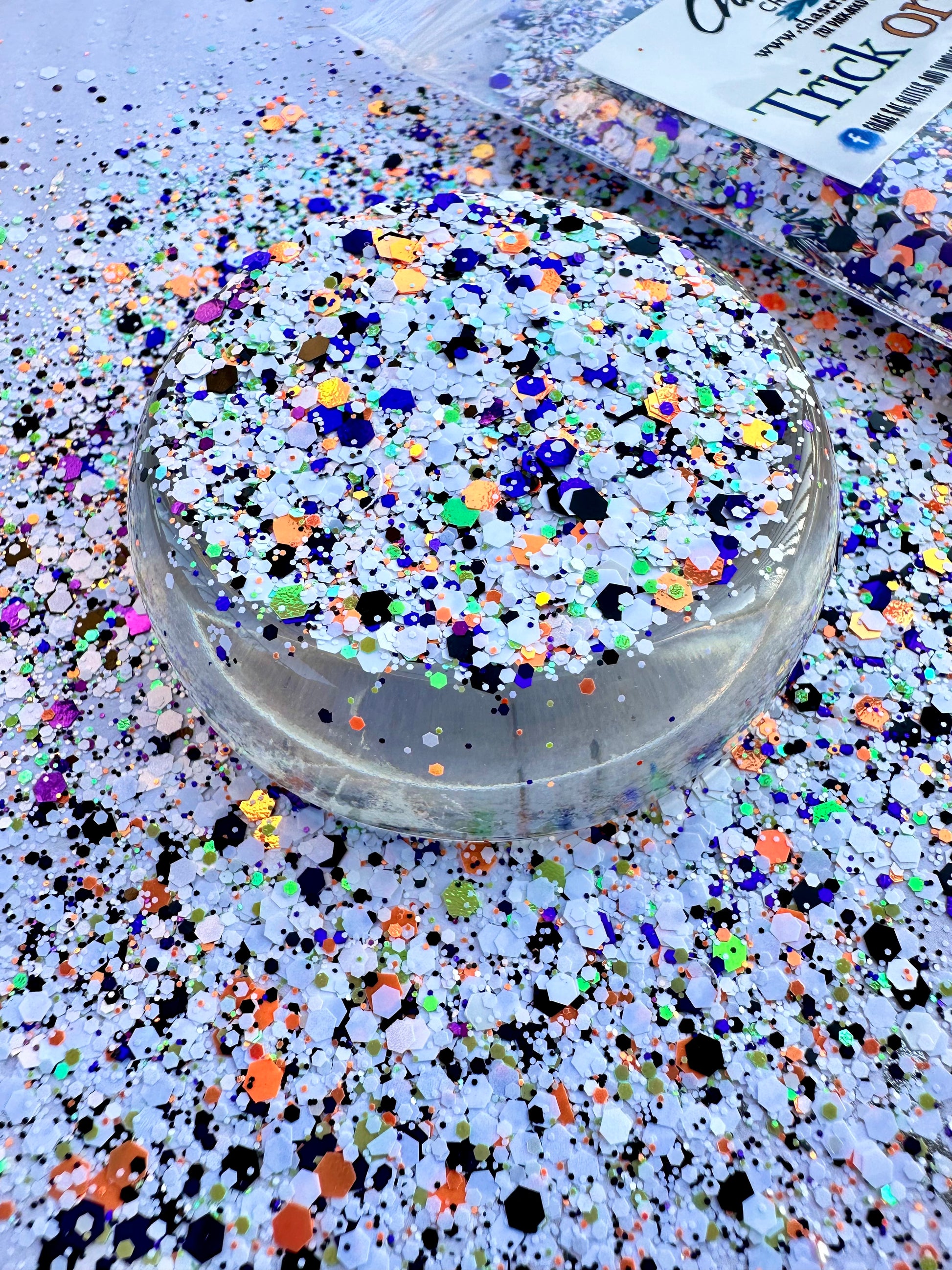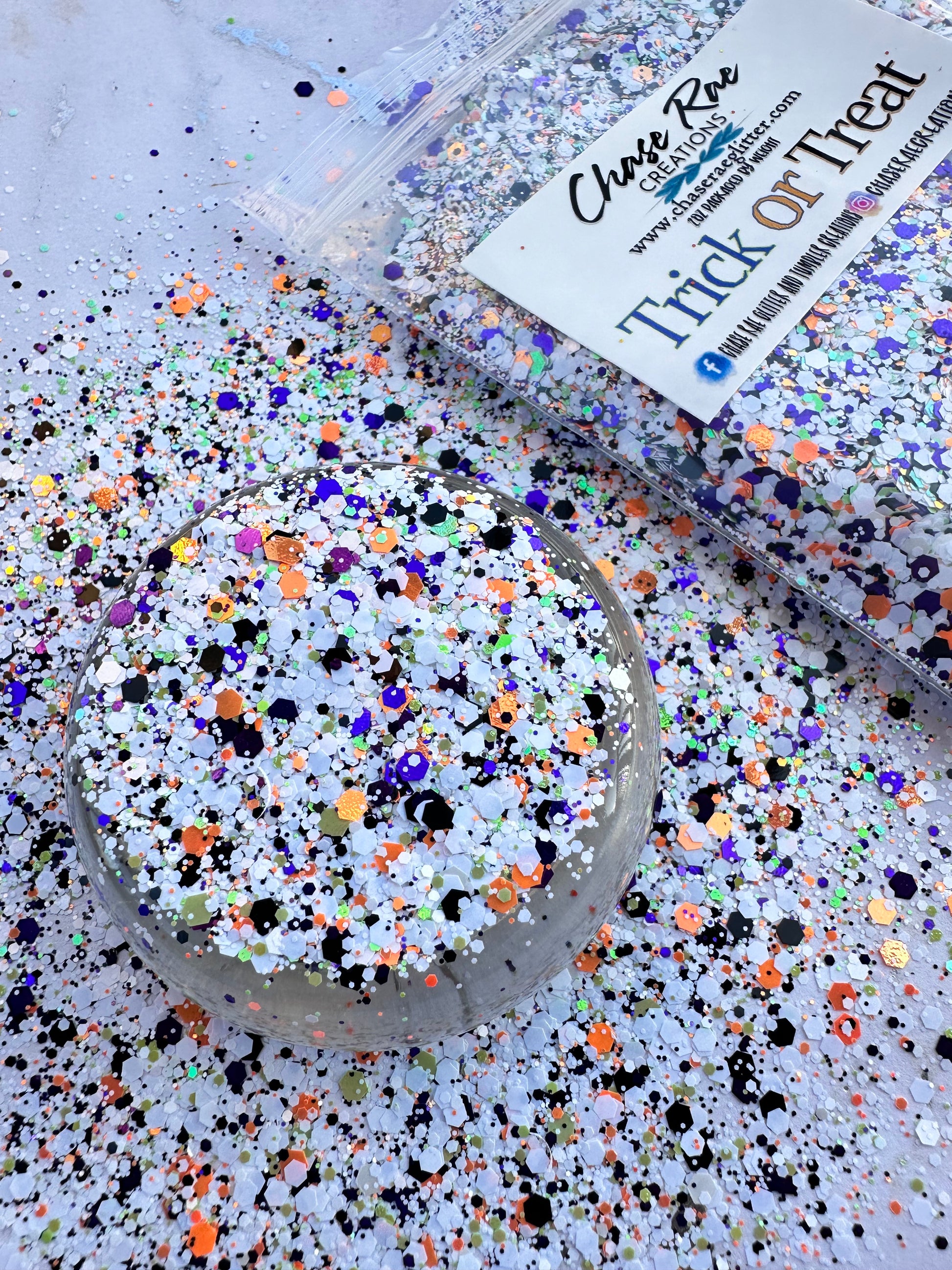 Trick or Treat is the perfect chunky Halloween glitter mix. The main color is a pearl white, mixed with orange, green, purple, and black.
