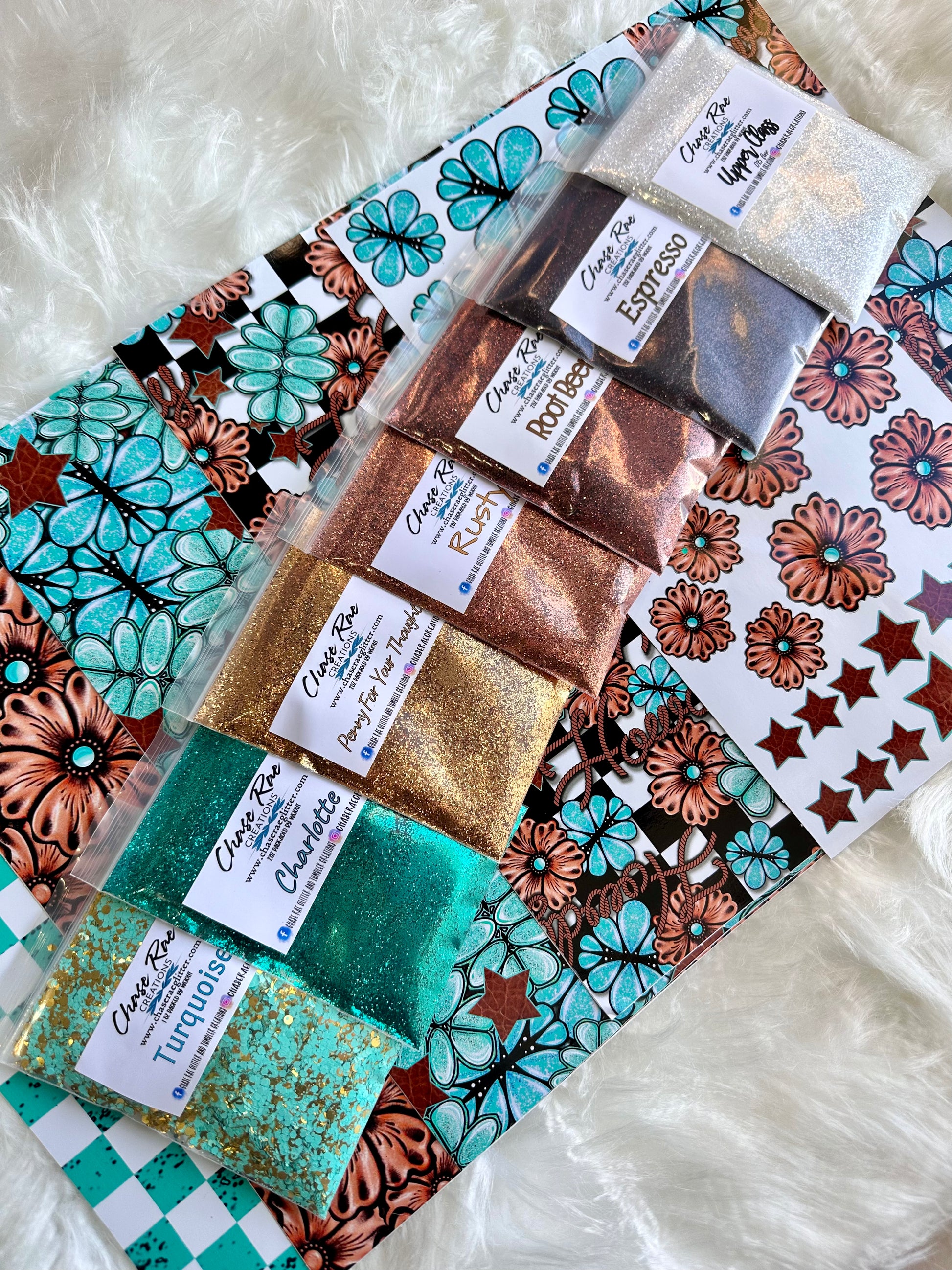 Listing is for GLITTER only! Bundle and save!! You'll get 2 oz of each: Turquoise, Charlotte, Penny for Your Thoughts, Rusty, Root Beer, Espresso, and Upper Class (fine)