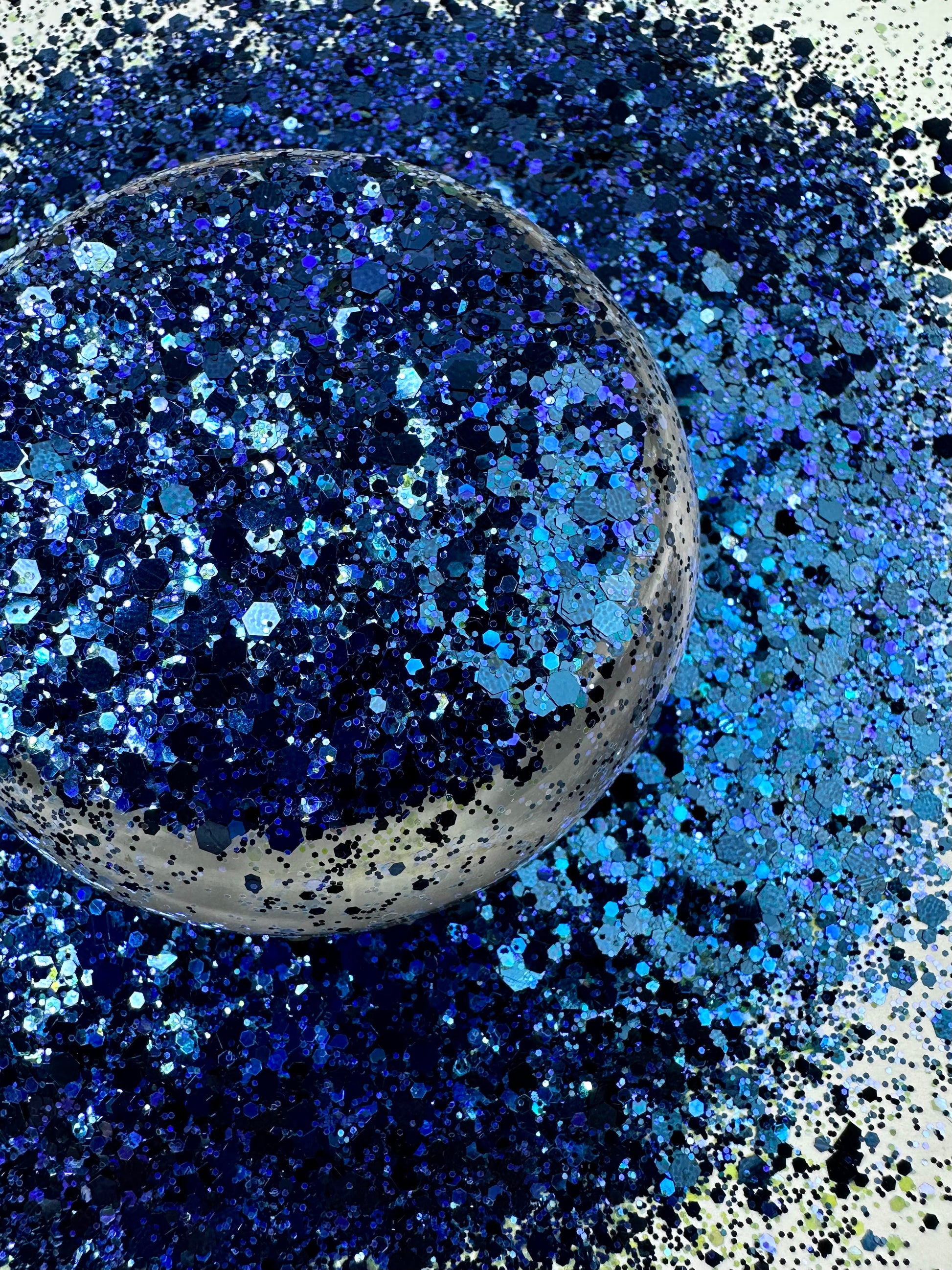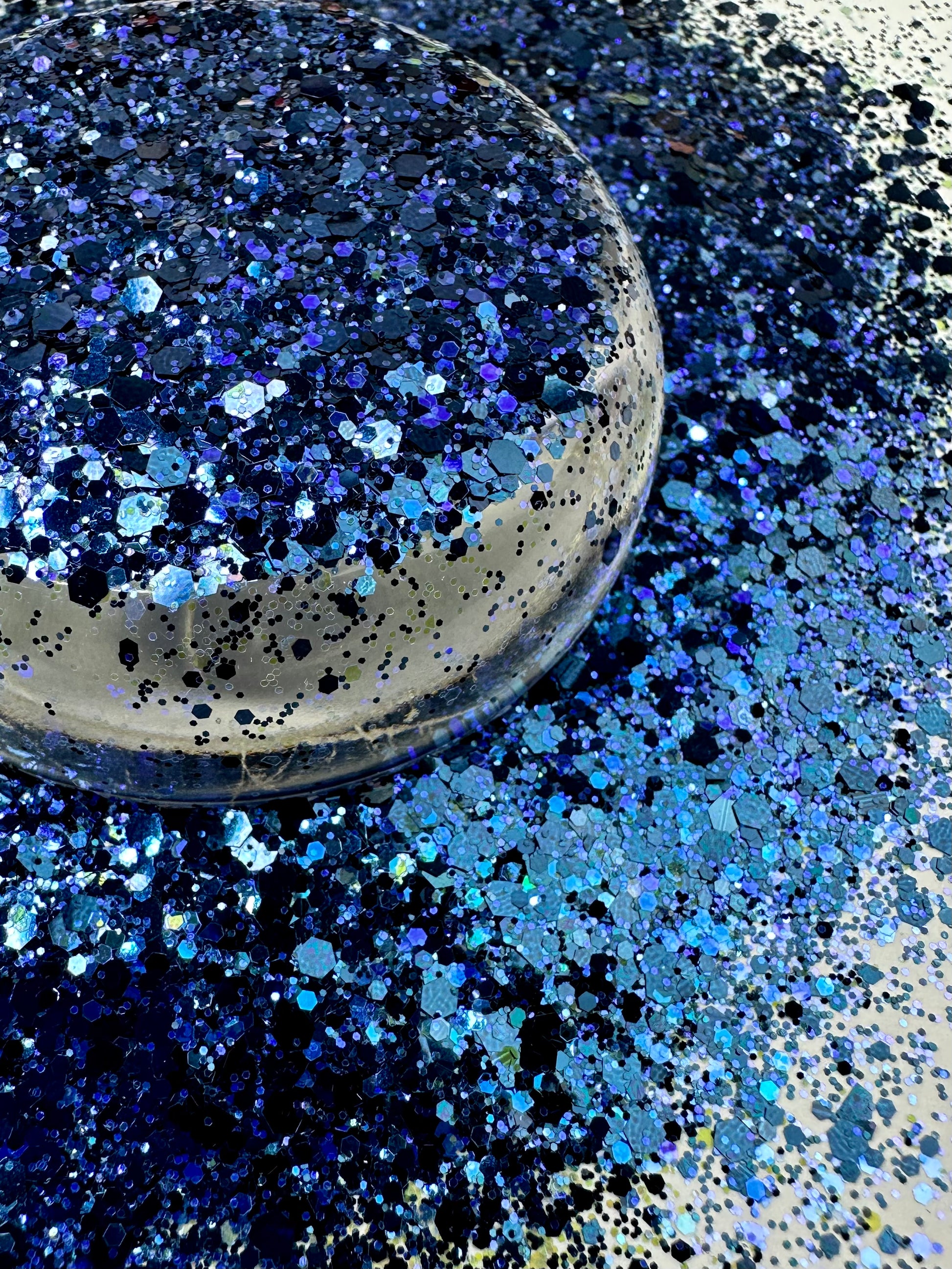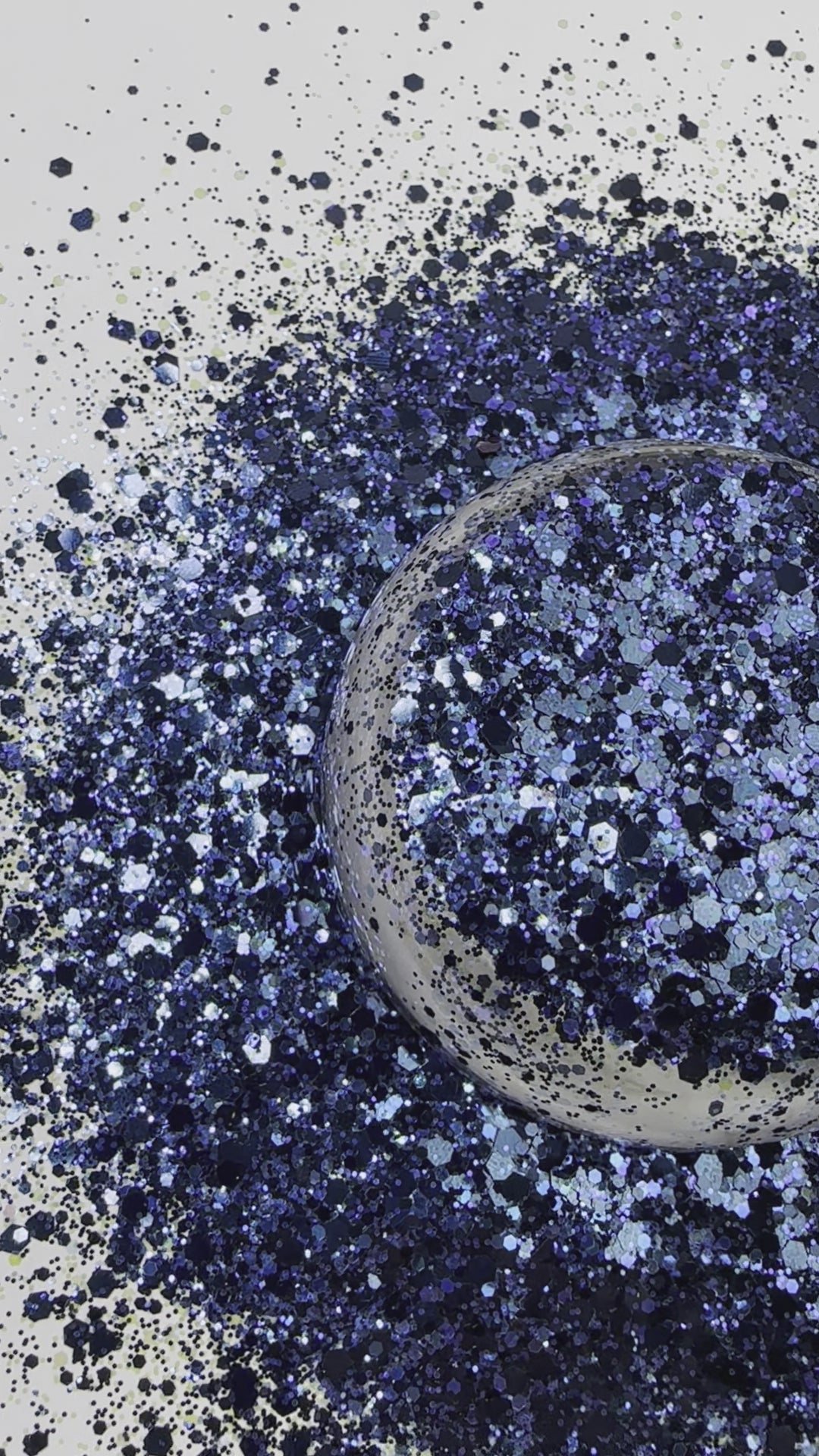A deep navy blue chunky mix with some ultra-violet sparkle.
