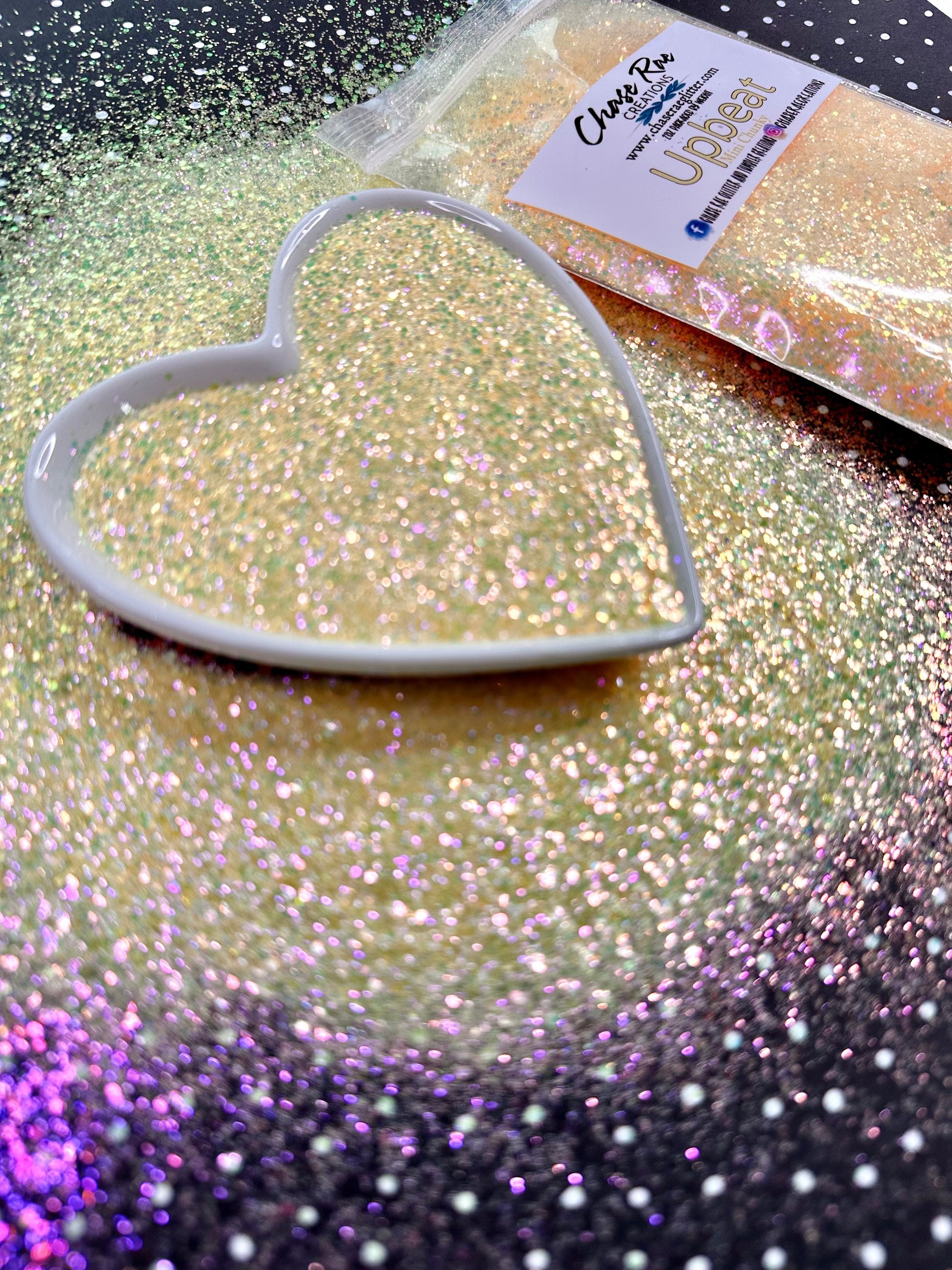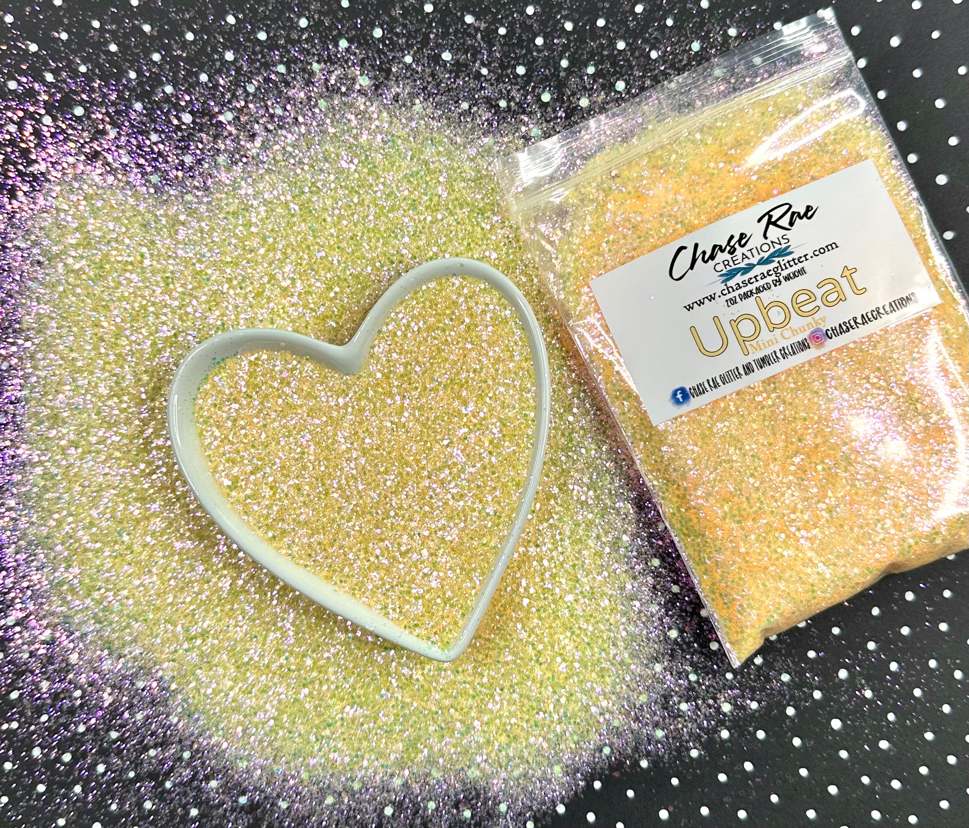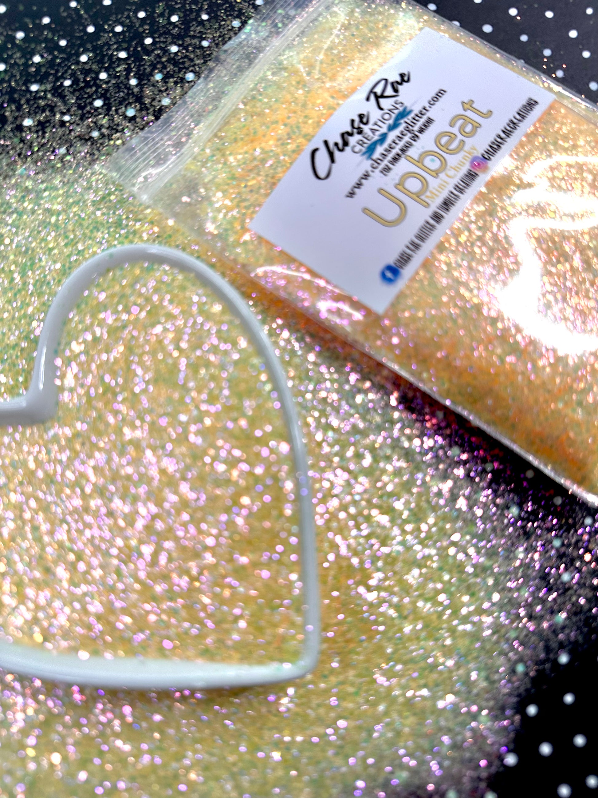 Upbeat Mini. Soft, orange, mini chunky mix with a pink iridescence on dark surfaces.