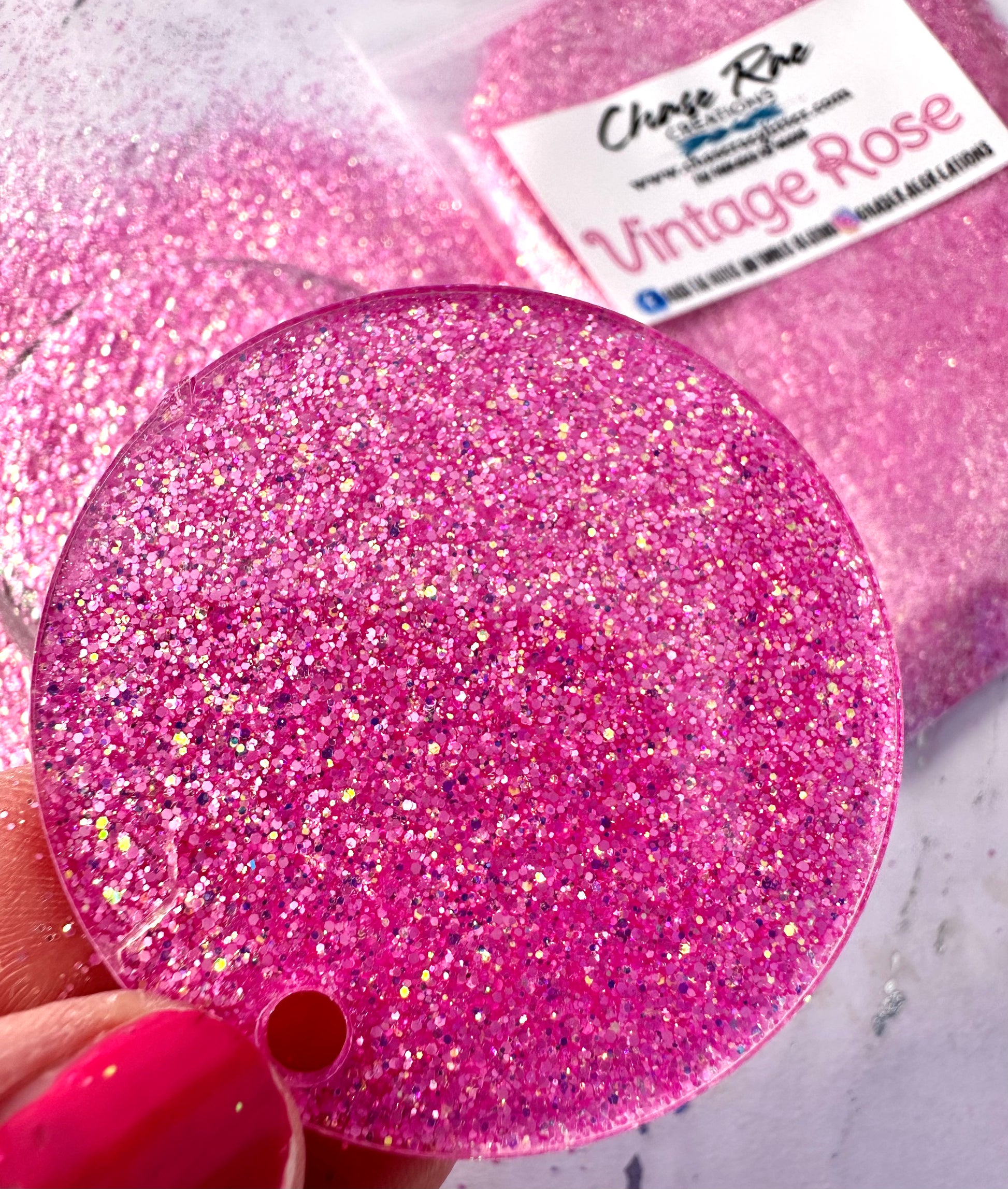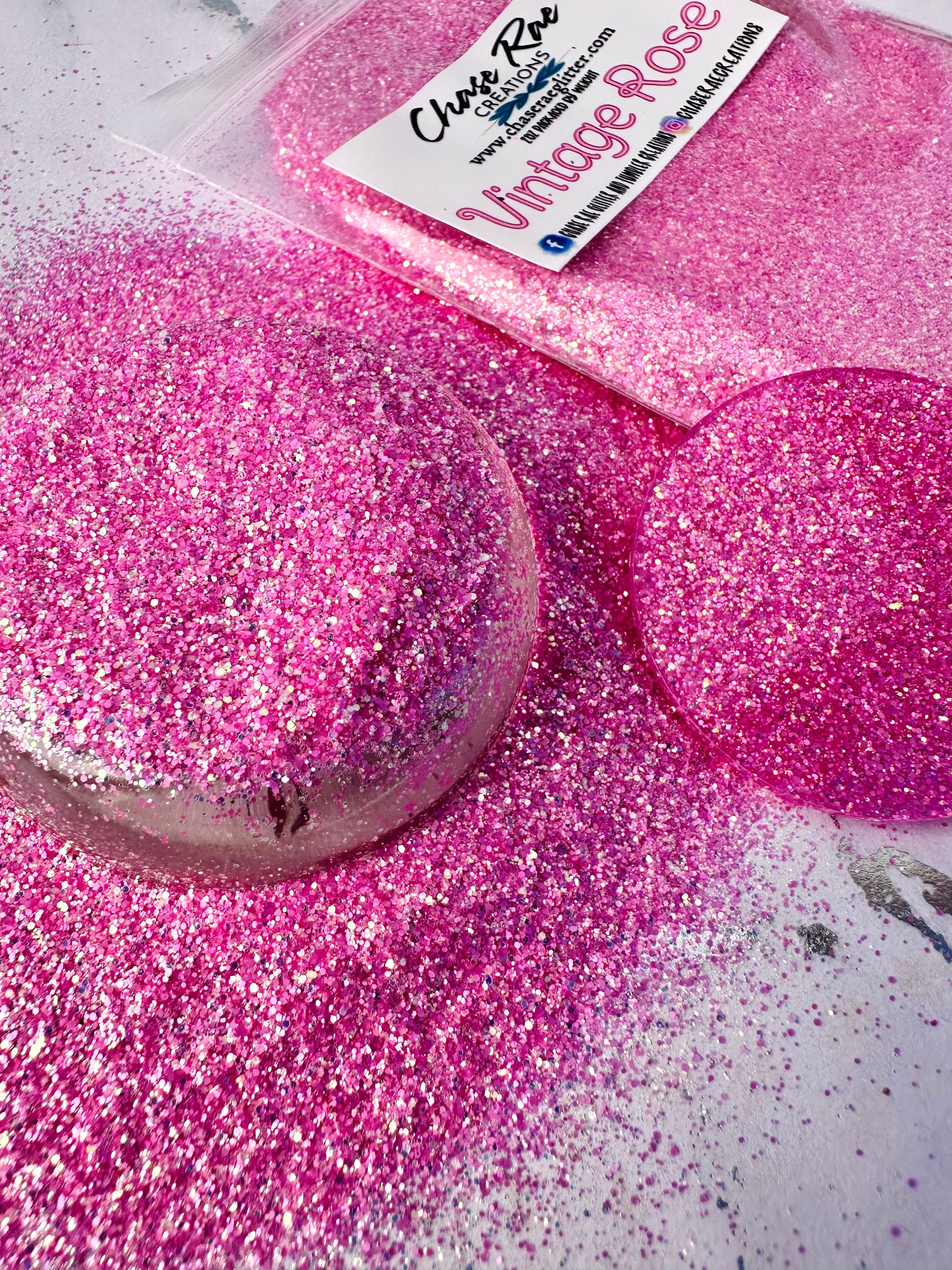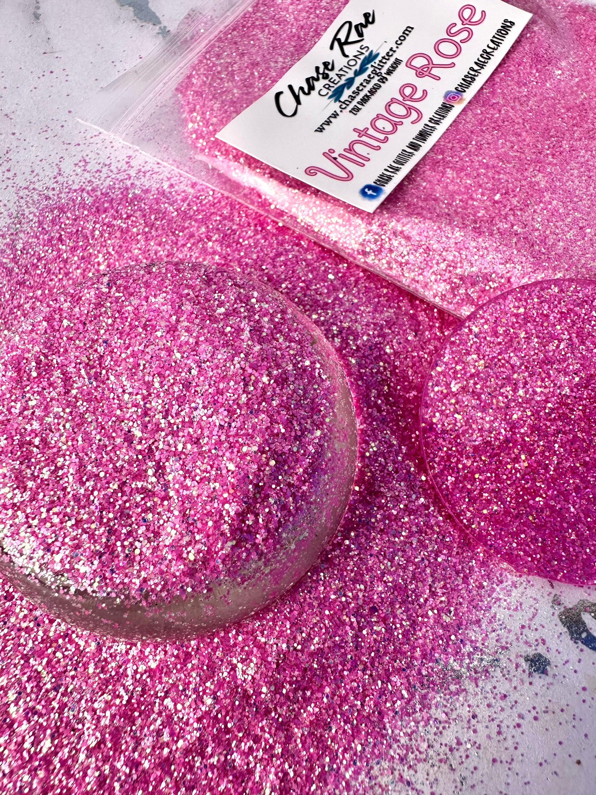 Vintage Rose is a semitransparent pink glitter. This one has some solid pearl pieces and a beautiful rainbow iridescence with opals.