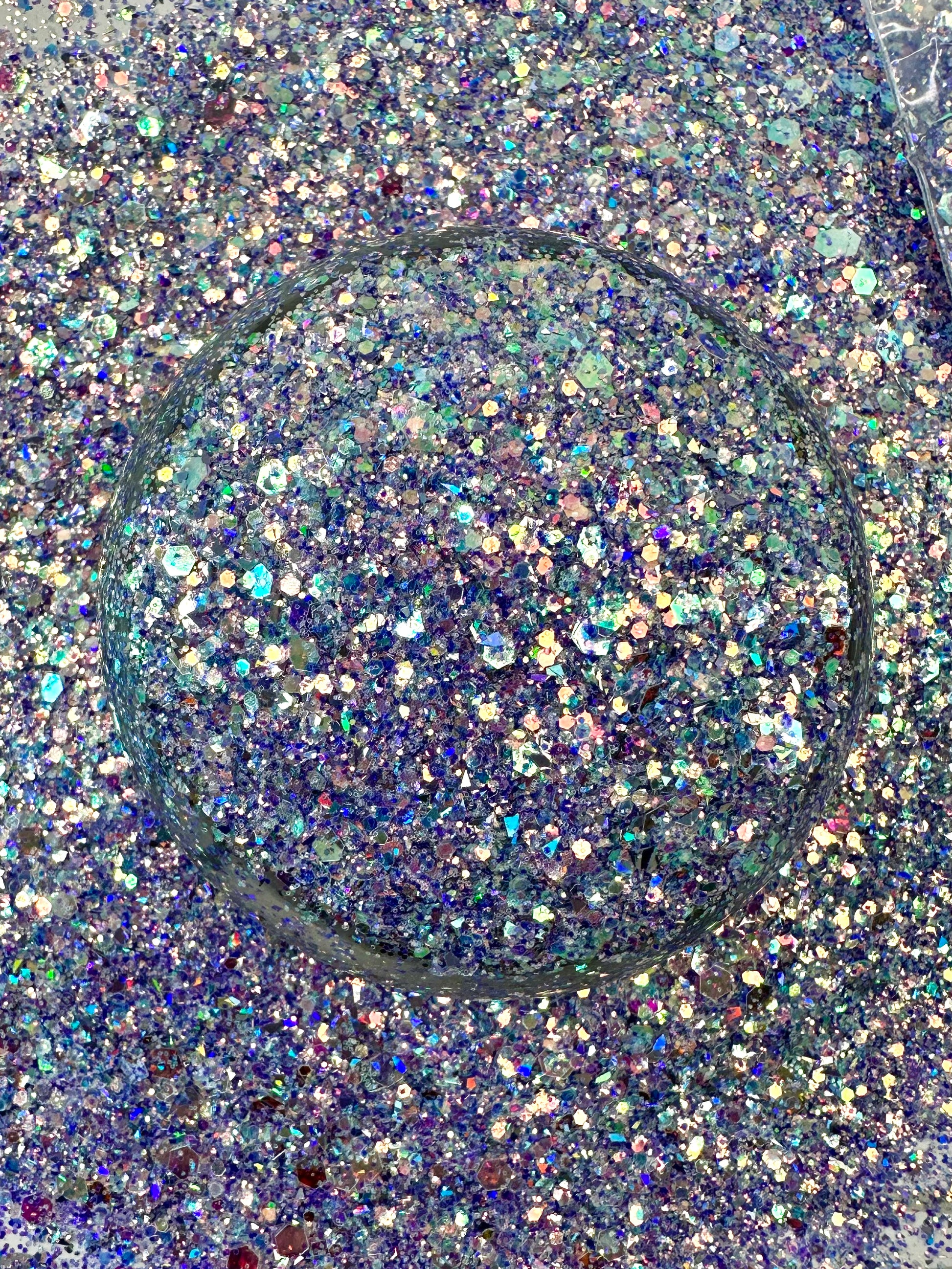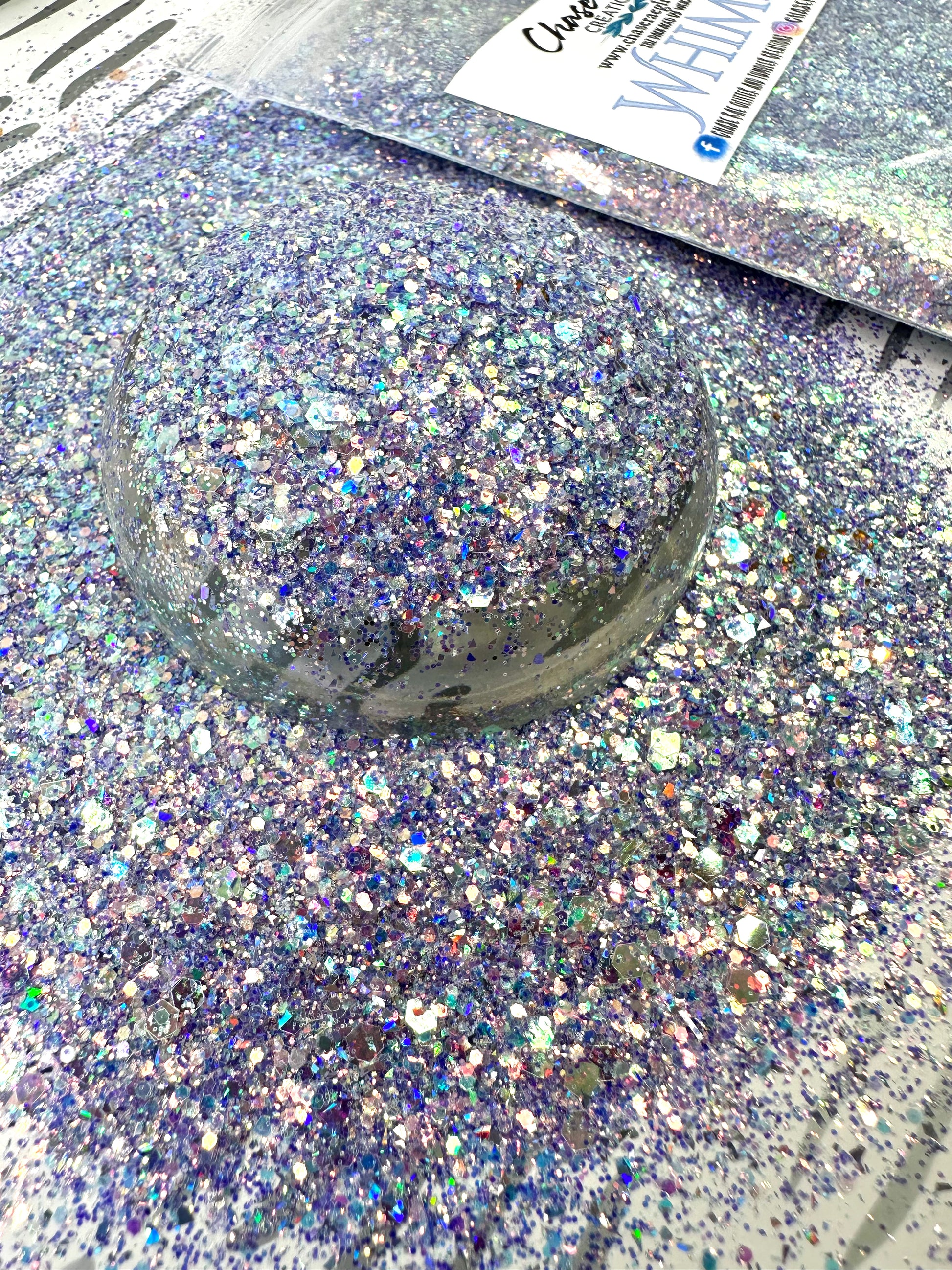 Whimsy is a light purple chunky mix. It throws some pink and blue as well. Lots of sizes in this beautiful glitter.