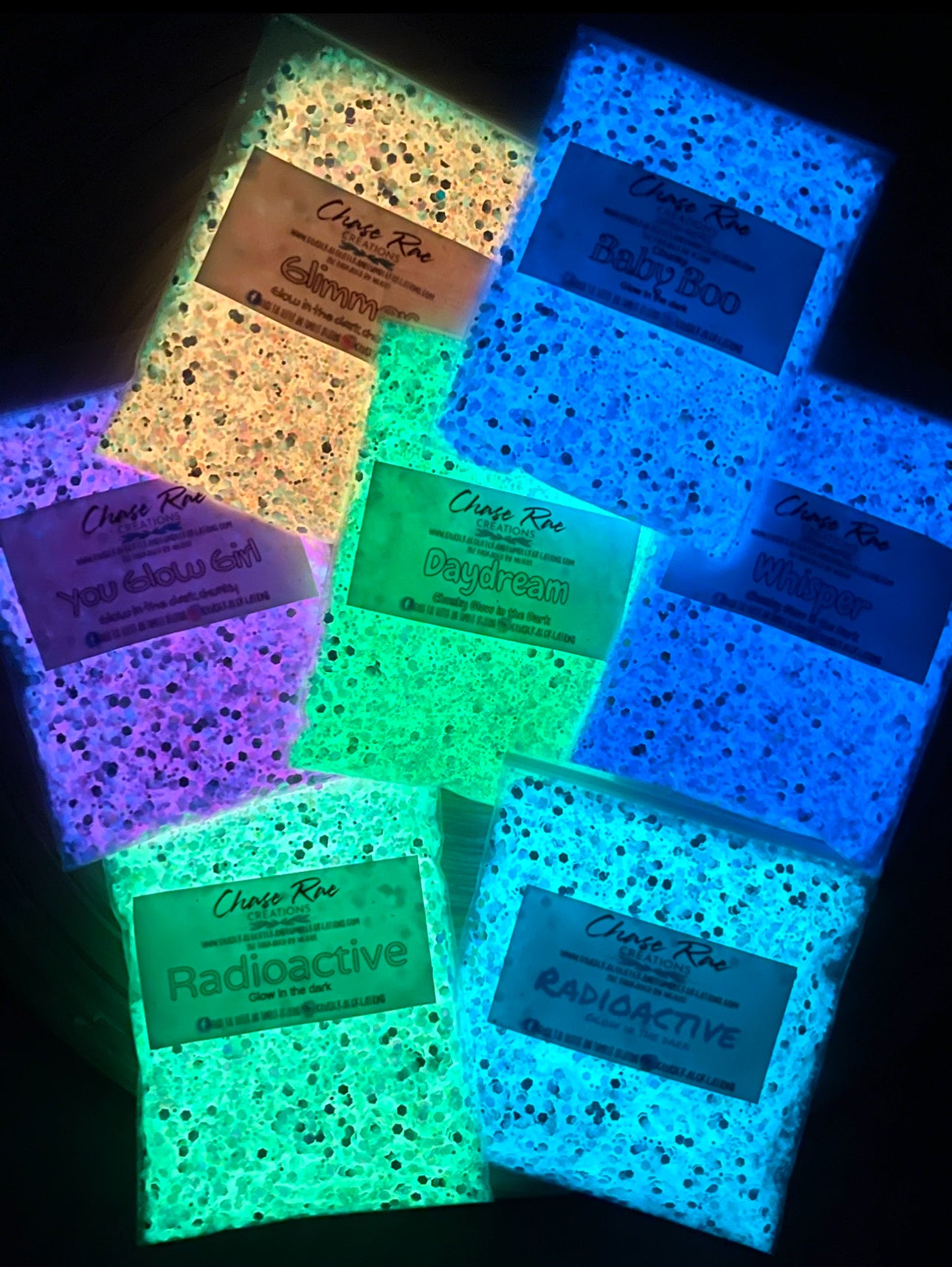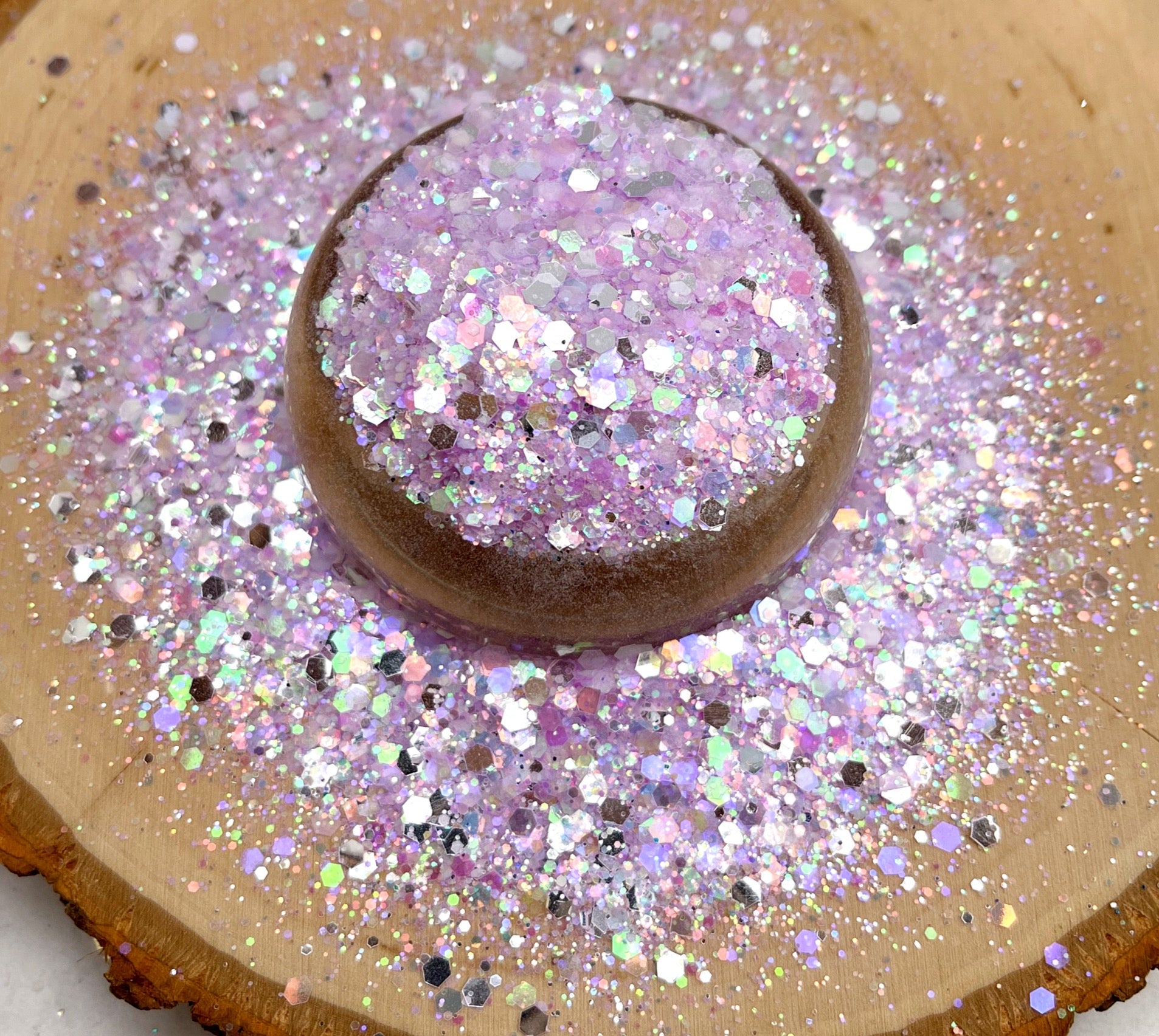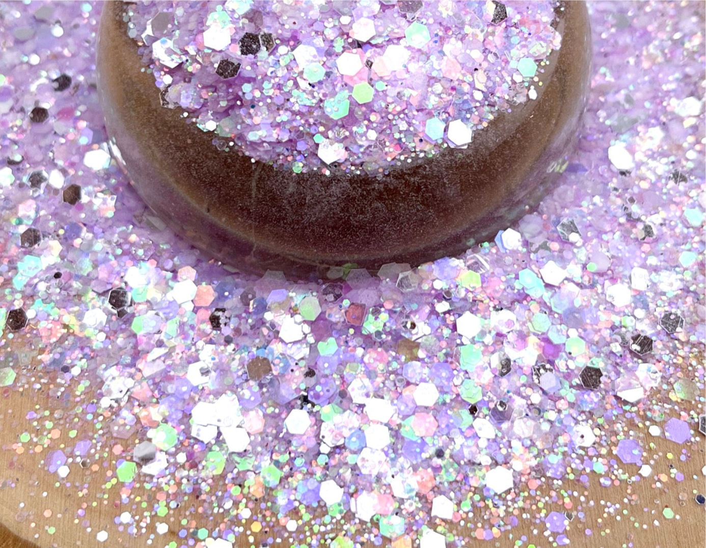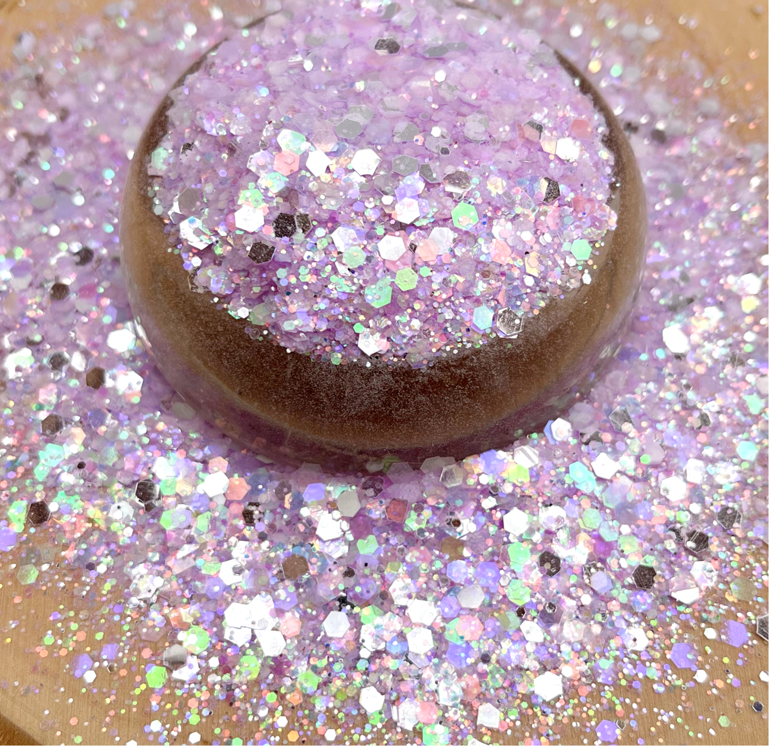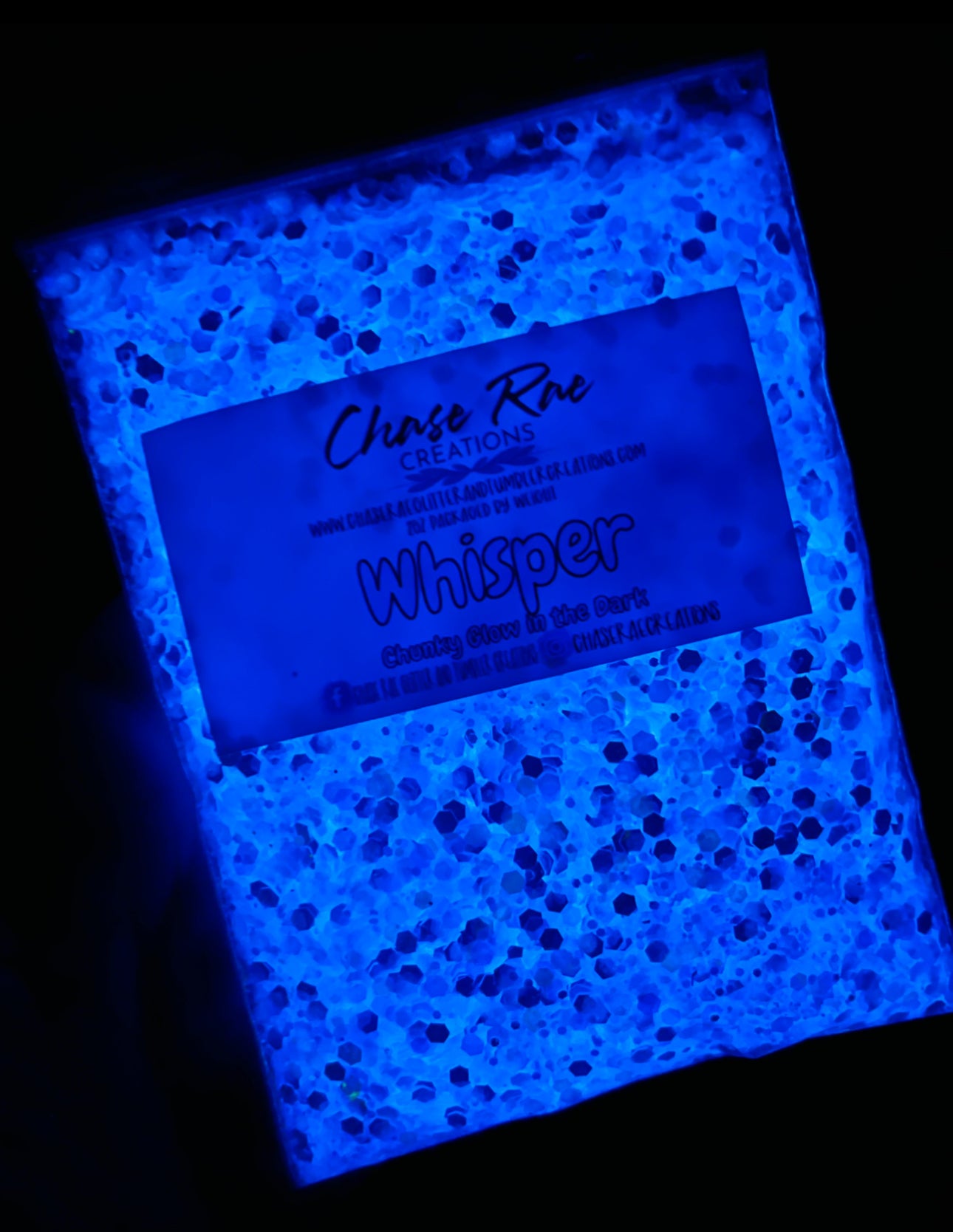 Whisper chunky is a beautiful pastel purple with a rainbow sparkle. Beautiful as is but is also GLOWS!!