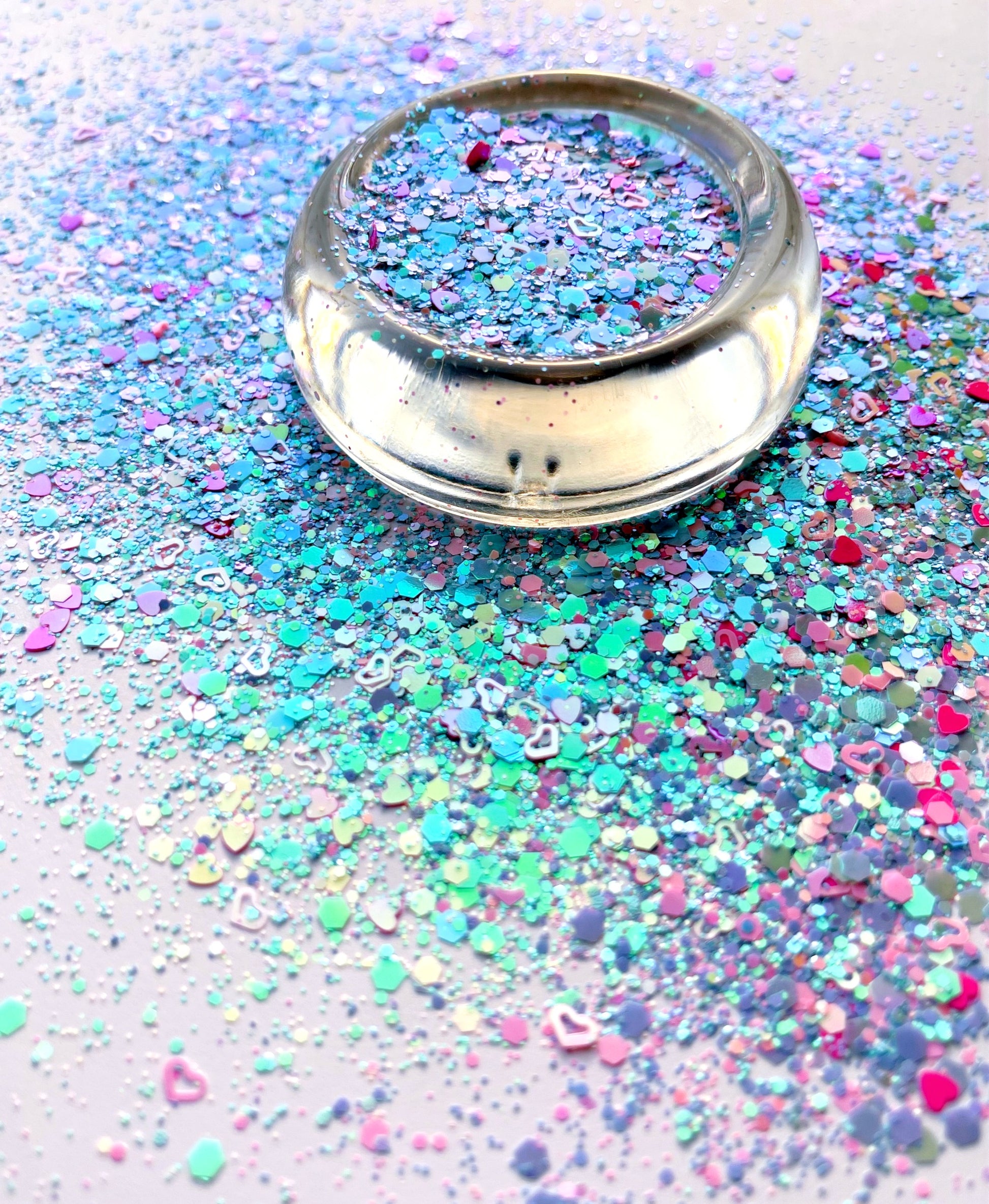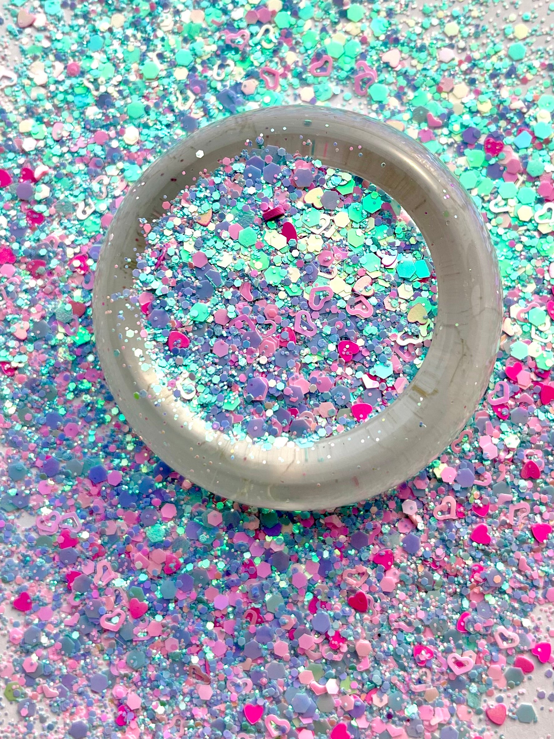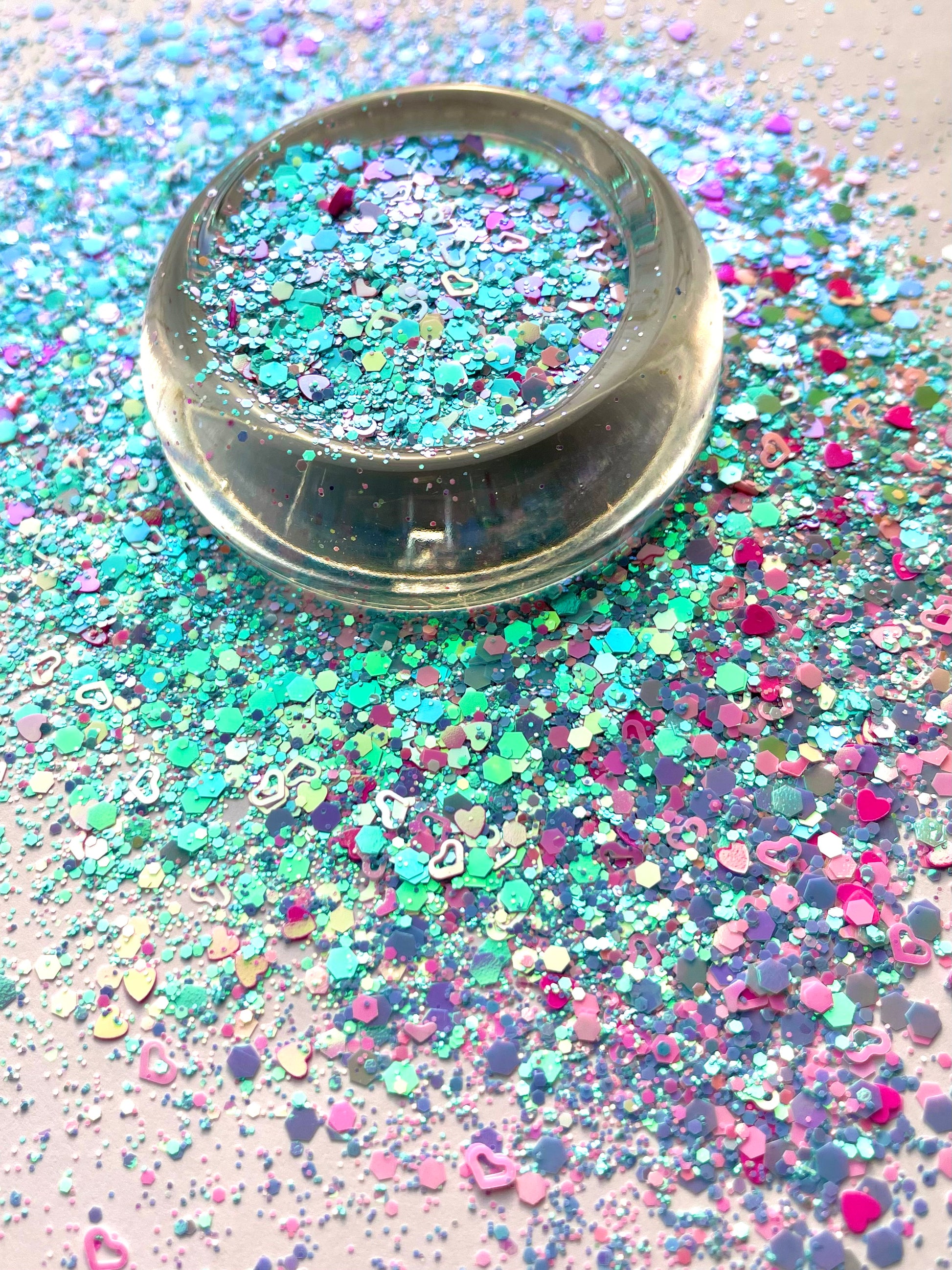 Wild Thing is gonna blow your socks off! A beautiful mix of iridescent pinks, and blues. Also in the mix are solid and hollow hearts. All solid colors.